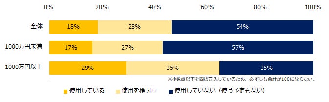 生成AIを自身の業務で使用しているかを伺うと、18%が「使用している」と回答しました。職種別で見ると、生成AIの使用率上位は「マーケティング・販促企画・商品開発系」(47%)、「コンサルタント系」(46%)でした。年収別では「使用している」と回答した「1000万円以上」の方は29%、「1000万円未満」の方は17%と、12ポイントの差が見られました。