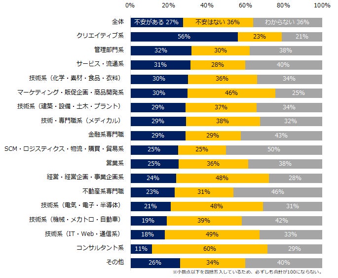 ★ 約3割が、生成AIによる仕事への影響に対して「不安がある」と回答。「クリエイティブ系」は半数以上が不安を抱える一方、「コンサルタント系」は6割が「不安はない」と回答。