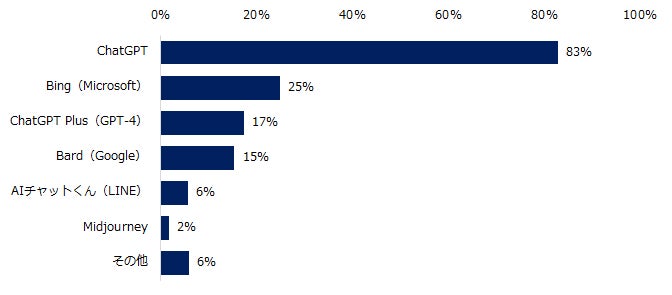 生成AIを業務で「使用している」「使用を検討している」と回答した方に、どの用途で使用(または検討)しているかを伺うと、トップは「ドキュメント要約・議事録作成・文字起こし」(54%)、次いで「挨拶文・返信文などメール作成」(46%)が続きます。使用している生成AIは「ChatGPT」が83%で最多でした。
