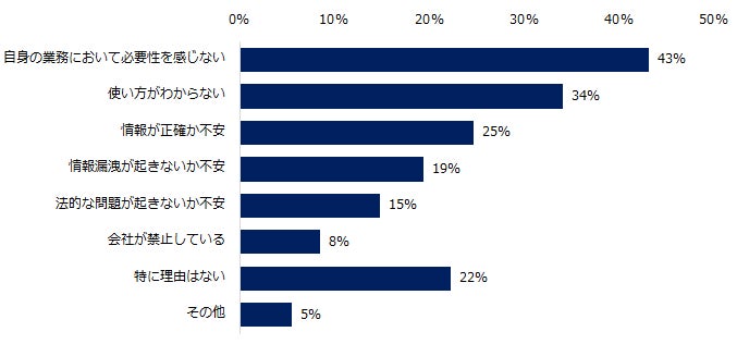また、生成AIを「使用していない(使う予定もない)」と回答した方にその理由を伺うと、上位は「自身の業務において必要性を感じない」(43%)、「使い方がわからない」(34%)、「情報が正確か不安」(25%)でした。