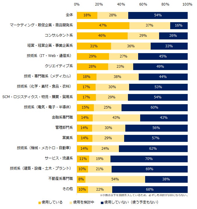 ★ 約2割が生成AIを業務で「使用している」と回答。職種別の使用率上位は「マーケティング系」「コンサルタント系」。年収別では12ポイントの差も。