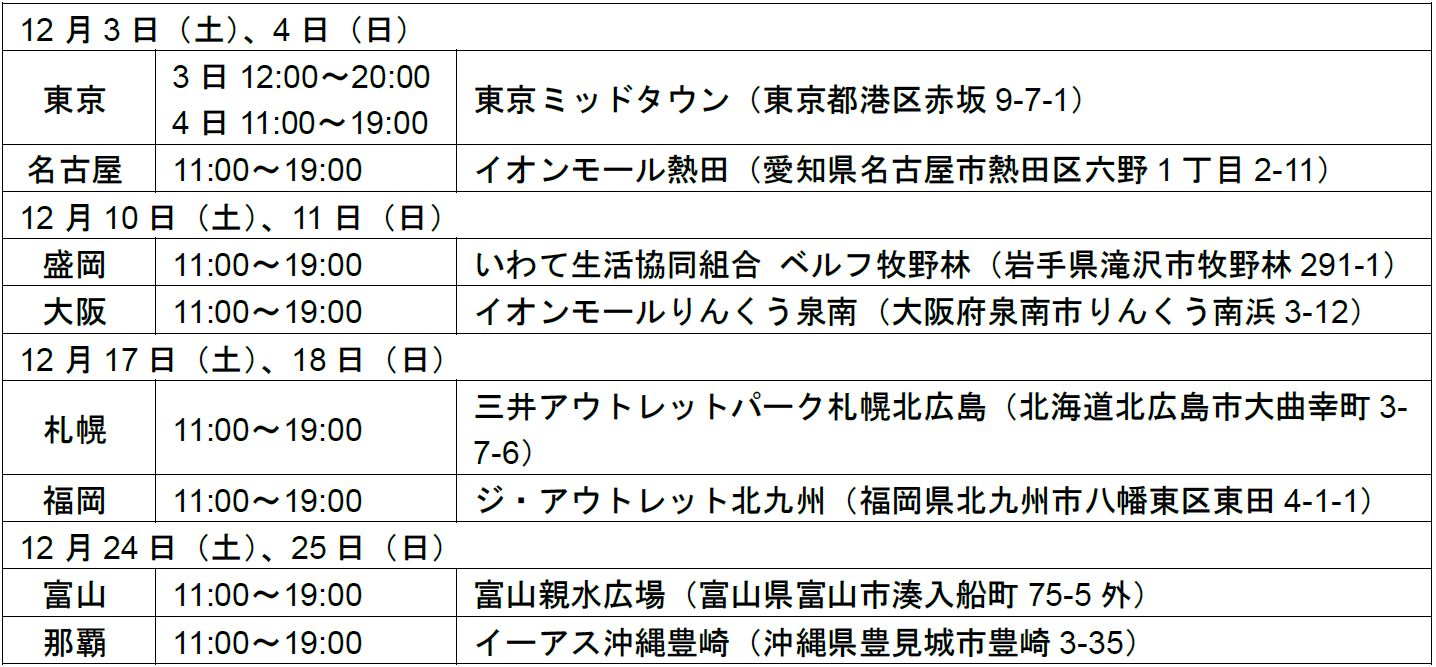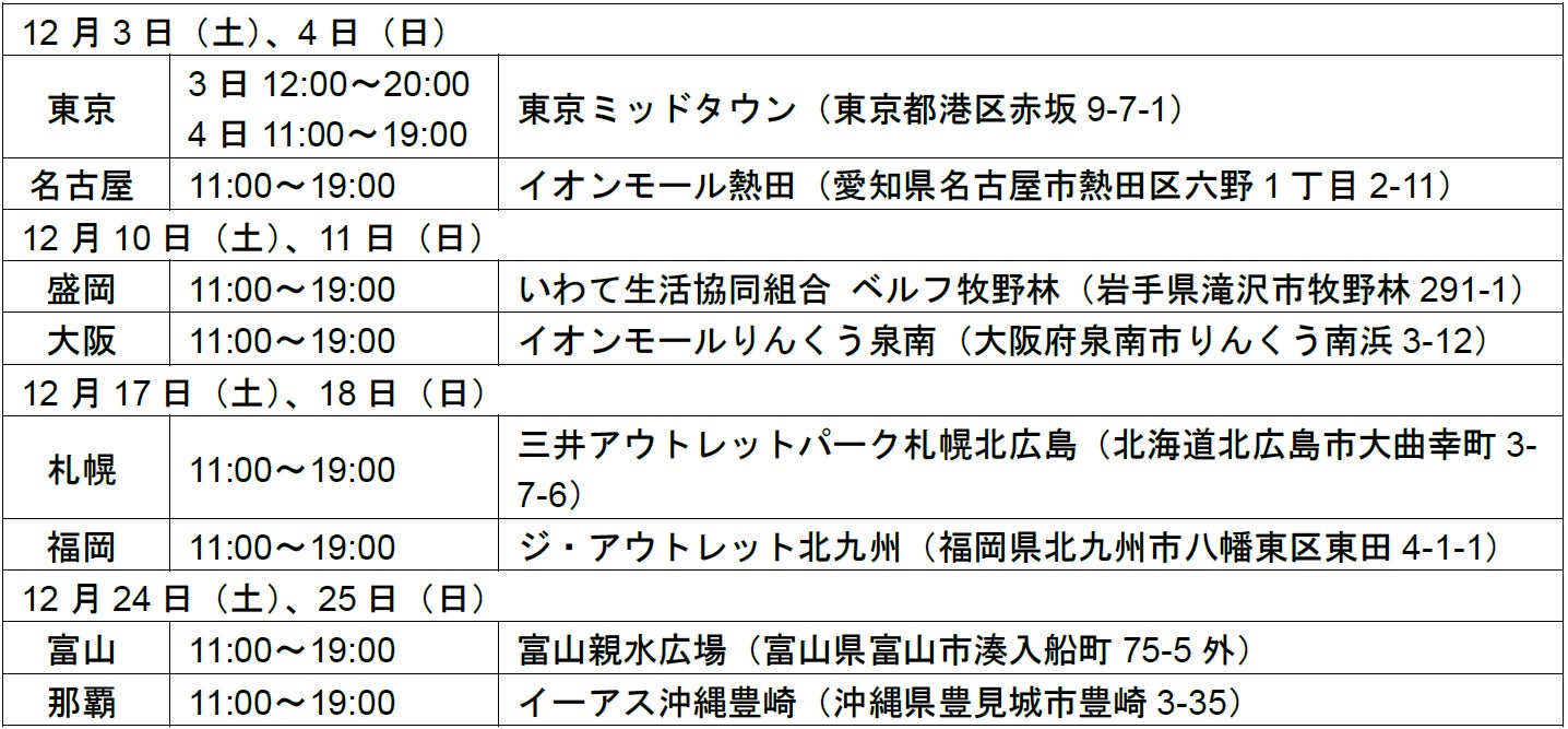 11:00~19:00の8時間 ※12月3日(土)東京のみ12:00~20:00となります