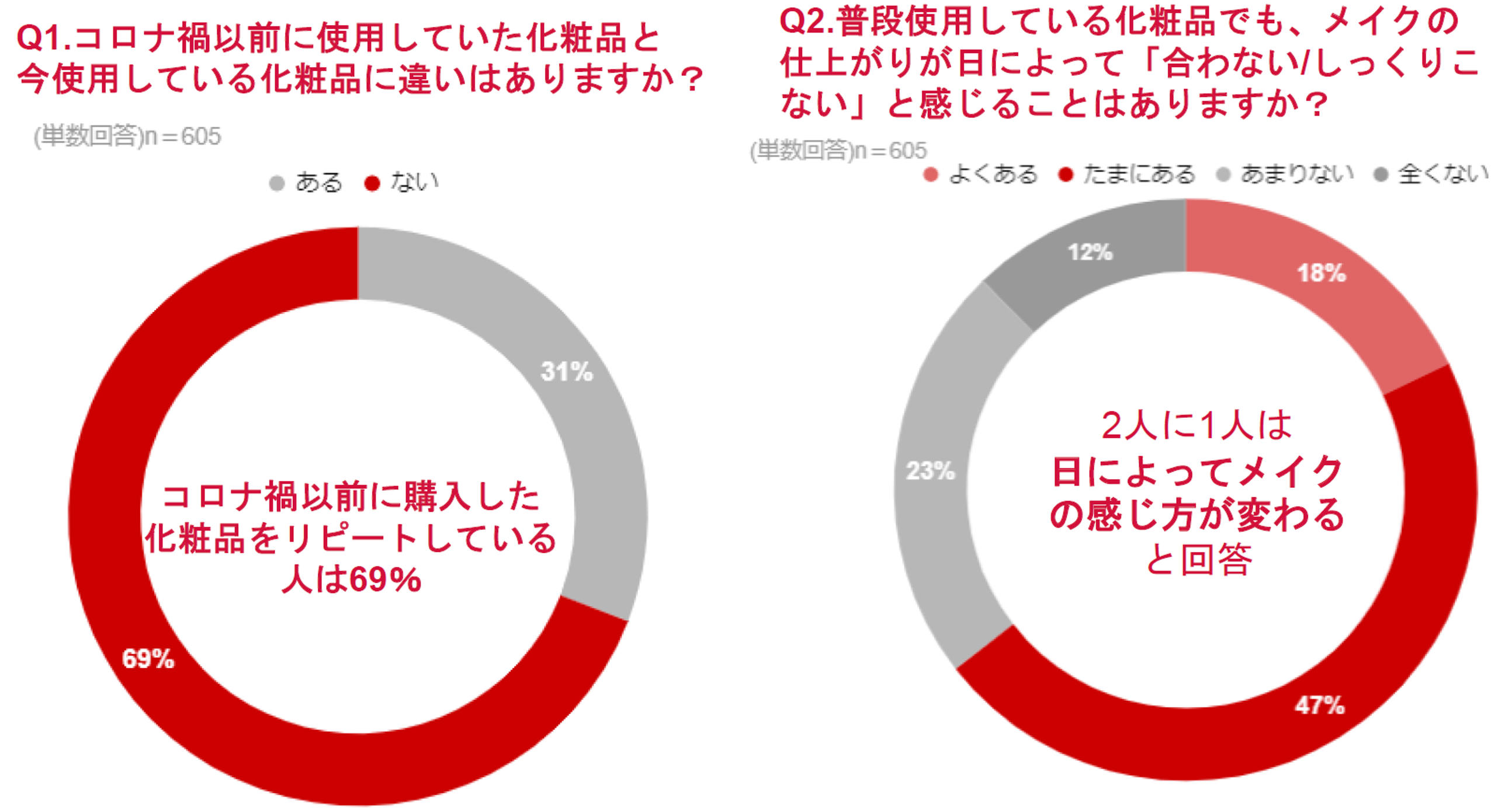 コロナ禍前に使用していた化粧品と現在使用している化粧品の違いに関して「違いはない」と回答した方は69%で、半数以上の方は使い慣れた化粧品を使用していると回答していました。