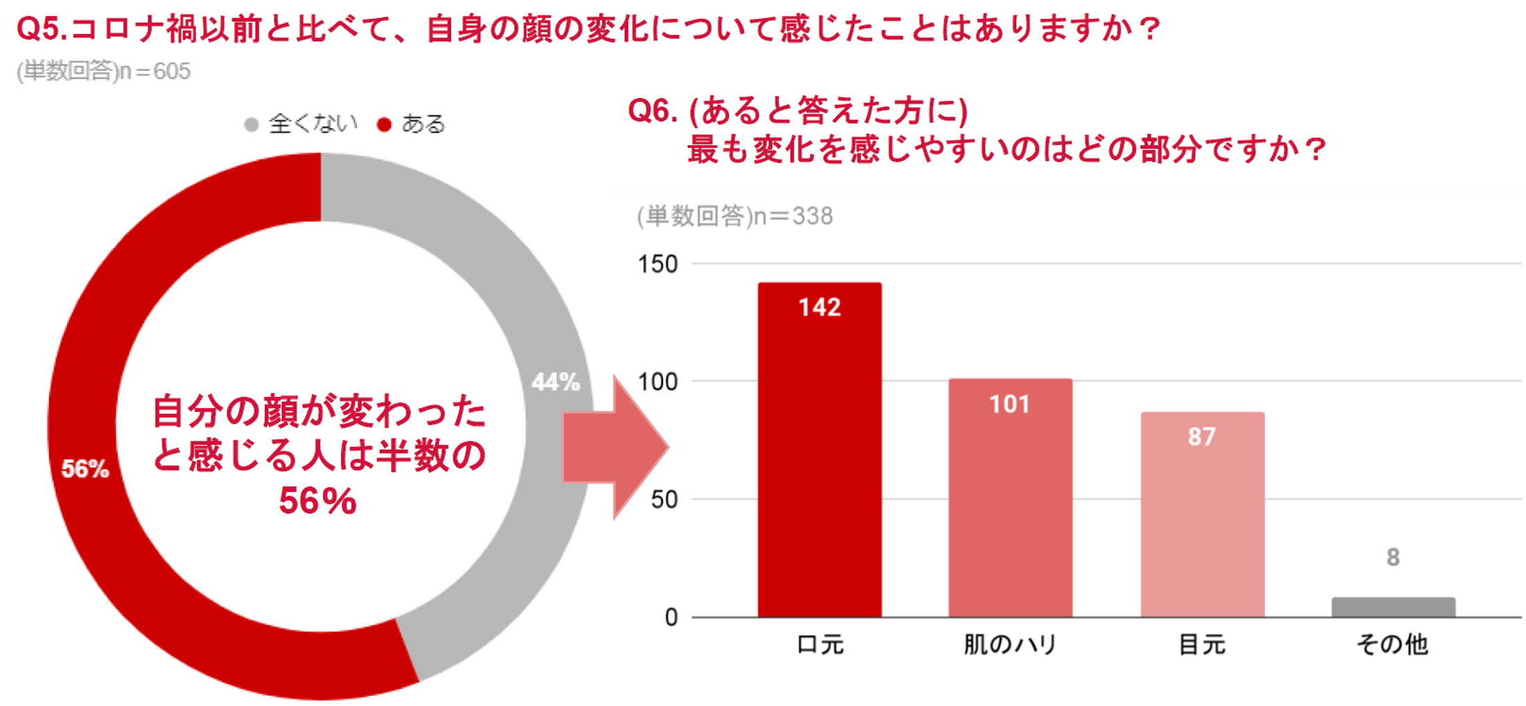 続いて、顔の変化に関してどのように感じているのか調査をおこないました。自身の顔について変化を感じると回答した方は全体の56%で、コロナ禍におけるこの3年間で半数以上が顔に変化を感じていると回答しました。特に変化を感じる部位として、最も多かったのは「口元」で142名(42%)という結果になりました。