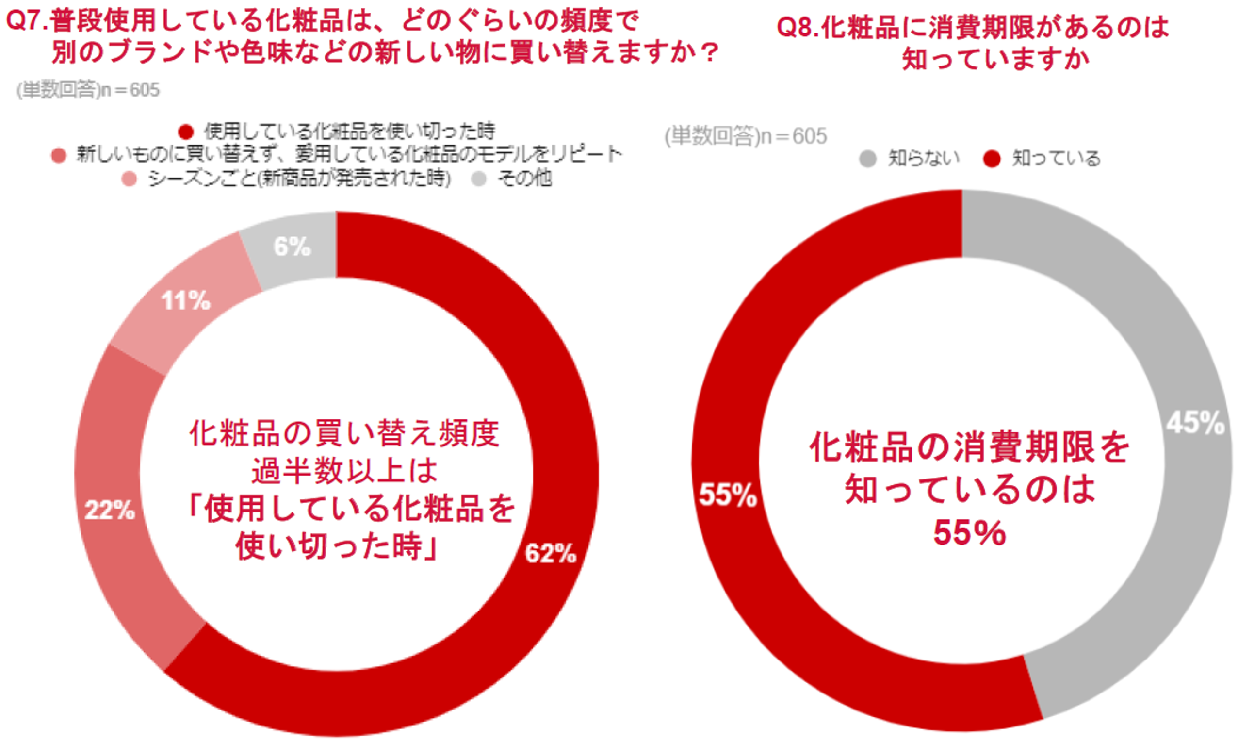 また、化粧品には消費期限(品質保持期限)が設けられていますが、「消費期限を知っている」と回答した方は55%という結果になりました。