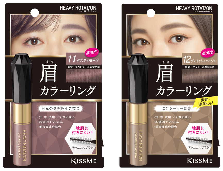 「キスミー ヘビーローテーション カラーリングアイブロウ」から顔に自然に馴染み、いつもと一味違った印象のトレンド眉を楽しめる「11:ダスティモーヴ」、「12:グレイッシュベージュ」の2色が新登場!