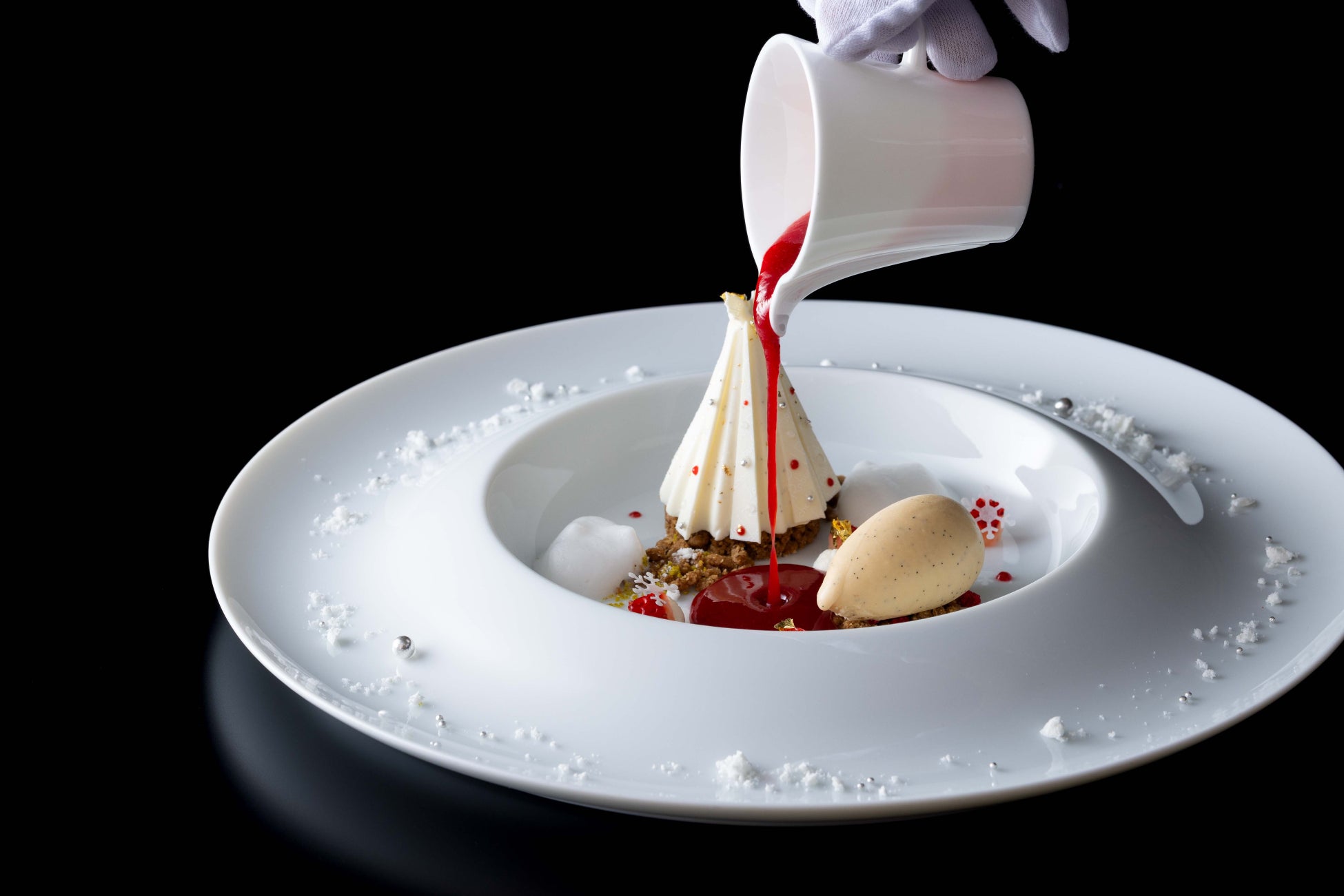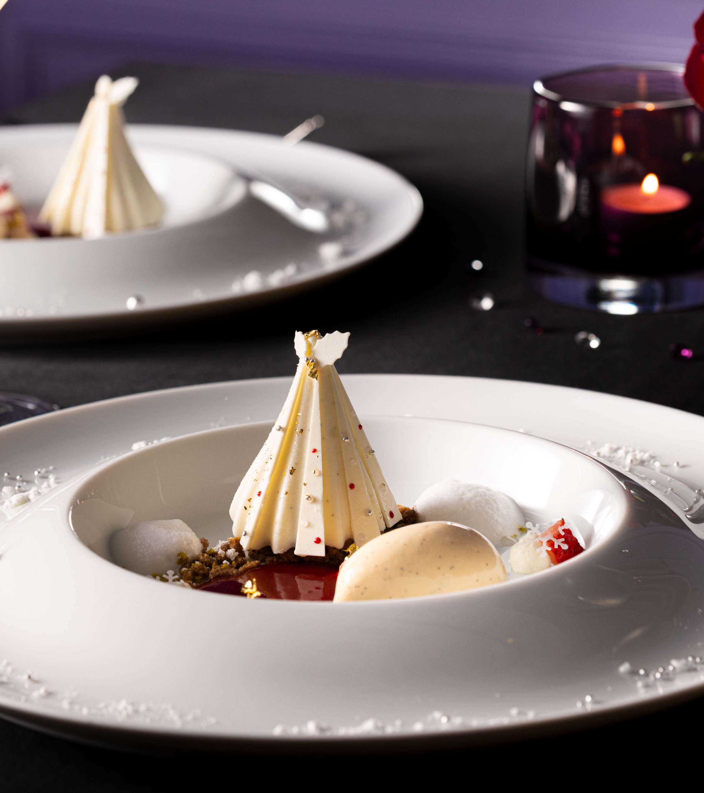 クリスマスツリーに見立てたショコラブランのムースにエピス香る苺のクーリとタヒチ産バニラのグラスを添えて
