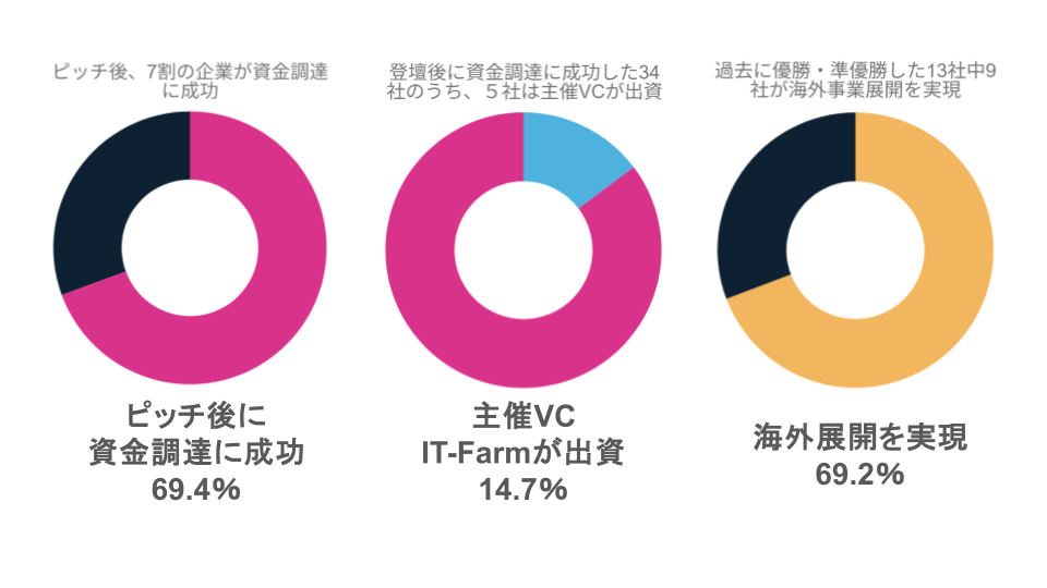 XTC日本大会は、ピッチ登壇社の資金調達の高い成功率が特徴です。XTC JAPAN 2020-2024のファイナリスト49社のうち34社は登壇後に資金調達に成功しており、そのうち5社は主催VCであるIT-Farmが出資。過去に優勝・準優勝した13社中9社は今では海外事業展開を実現しており、XTC JAPANは事業性や世界的ポテンシャルの高いテクノロジー・スタートアップが数多く参加しています。