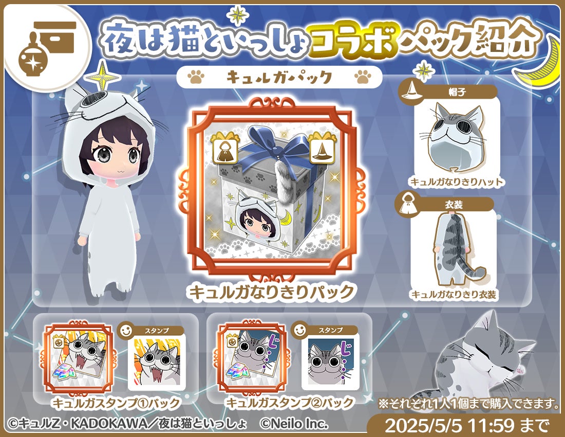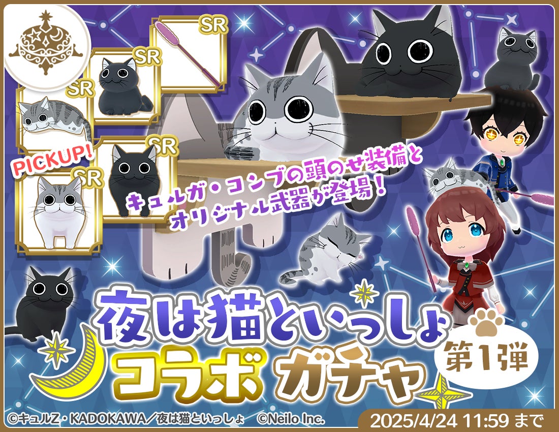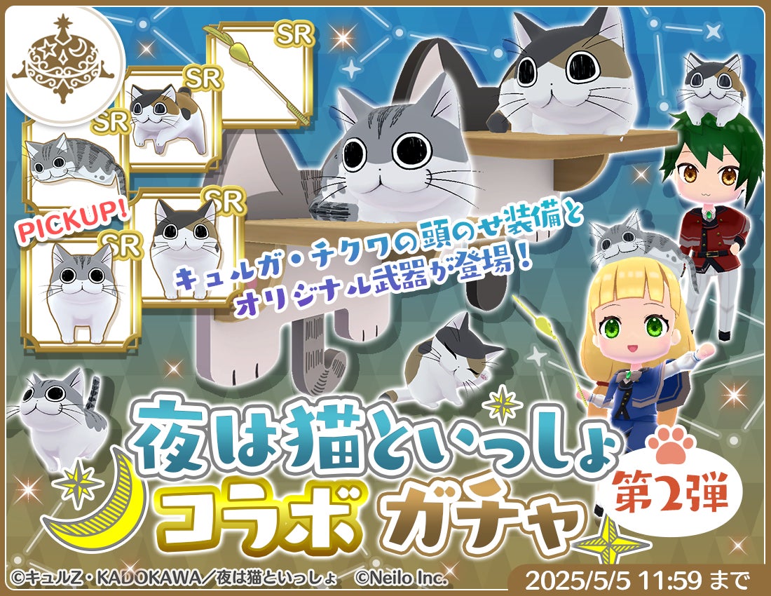 第1弾では「キュルガ」や「コンブ」の衣装や装備、第2弾では「キュルガ」や「チクワ」の衣装や装備が手に入るガチャやパックを用意しています。『夜は猫といっしょ』コラボを一緒に楽しみましょう!