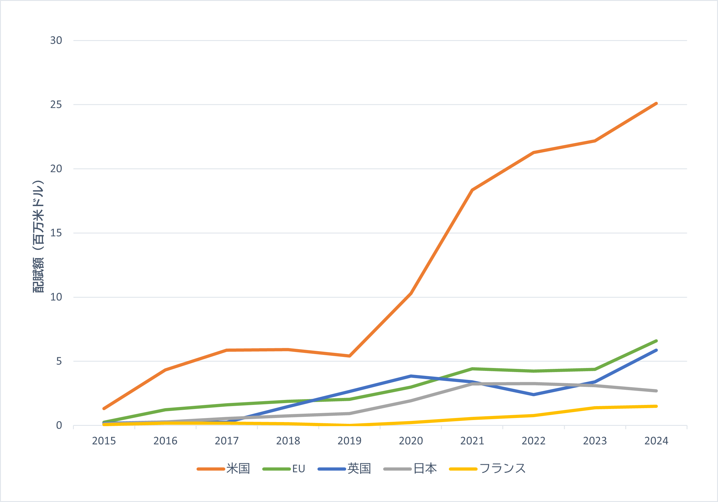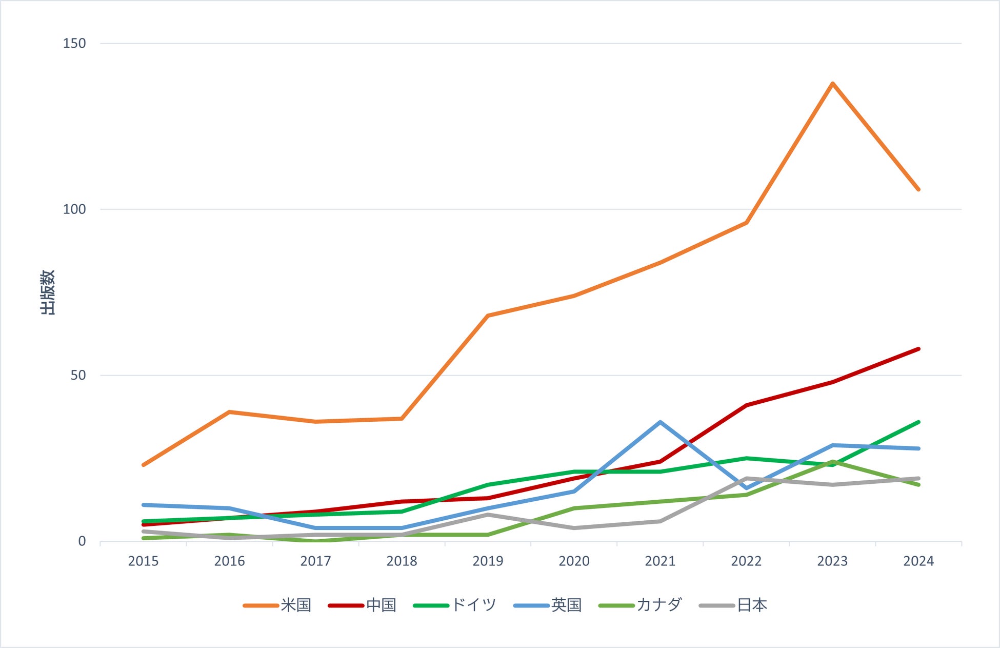 図1は、2015~2024年の期間における、自律実験に関連するグラント配賦額上位5か国のプロジェクト件数動向です。ただし、中国はグラントデータを非公開としており、実態を反映していない可能性が高いため除外しました。また、公開直後のグラント情報にはデータベースに格納されていないものもあり、直近の集計値については過小評価されている可能性があります。