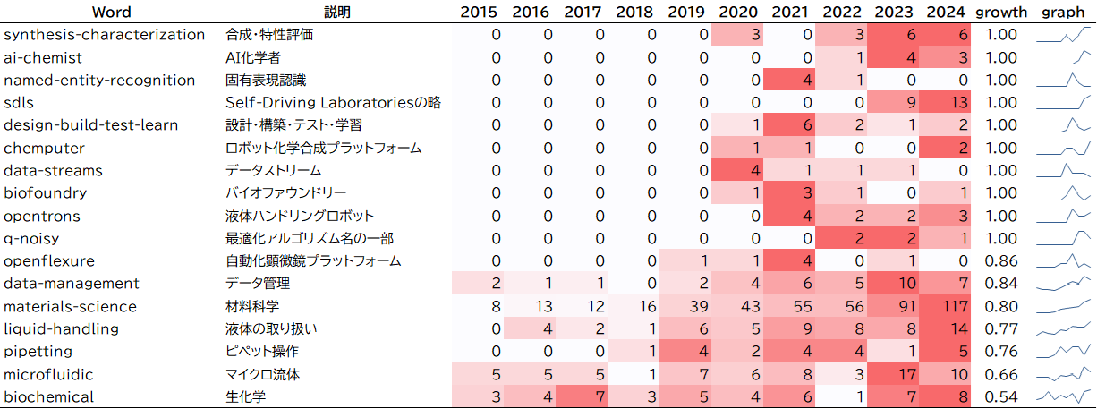 「synthesis-characterization」や「design-build-test-learn」など、実験操作だけでなく、実験結果の評価と分析までをセットで実行するシステムが想定されるキーワードが成長率上位に見られます。実験できまっておこなう操作をくりかえす段階から、考察と今後の展開構築も自動で実施するシステムの開発がはじまっているようです。