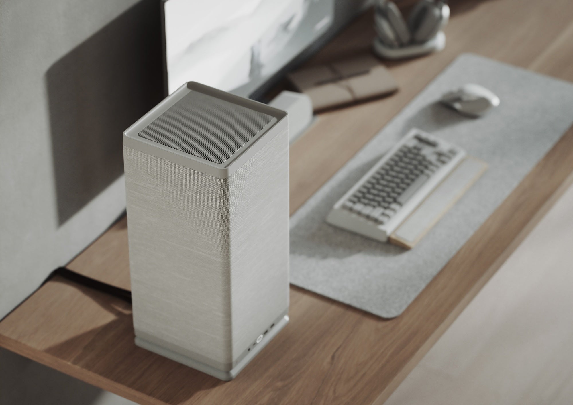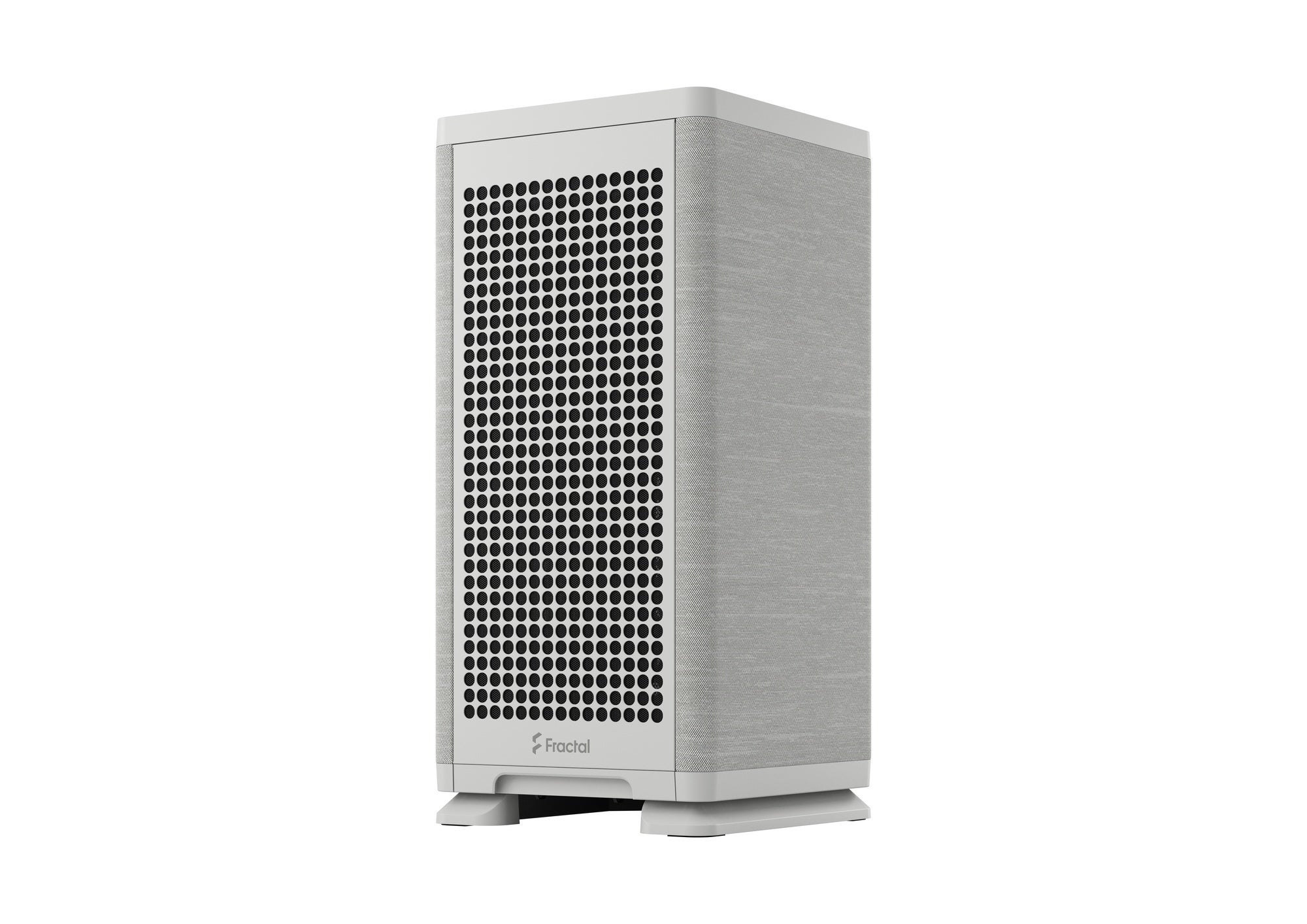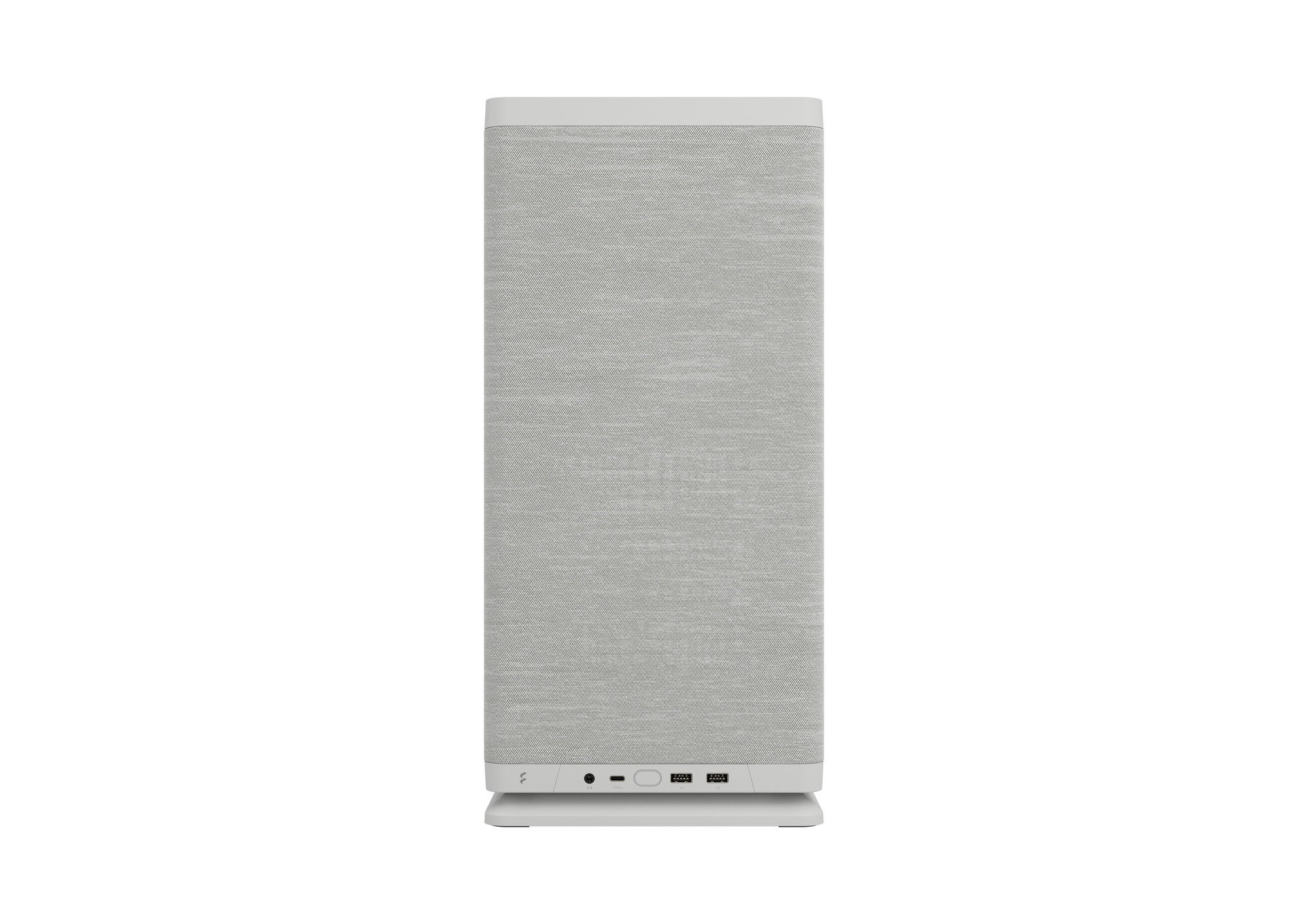 置き場所を選ばない、212×212mmのコンパクトなフットプリント。3面をファブリック素材で覆ったデザインで、あたかもスピーカーのような外観のミニタワー型PCケースです。リビングなどの生活空間にも溶け込み、モダンなインテリアにもマッチします。本体カラーは、ライトグレーとブラックの2色をご用意しております。