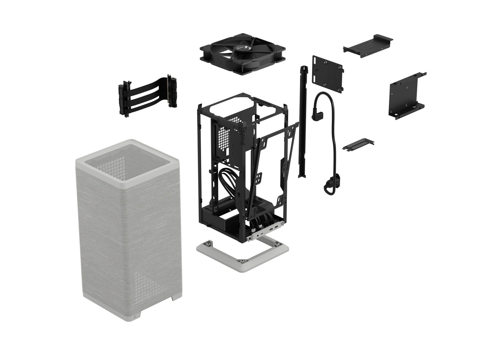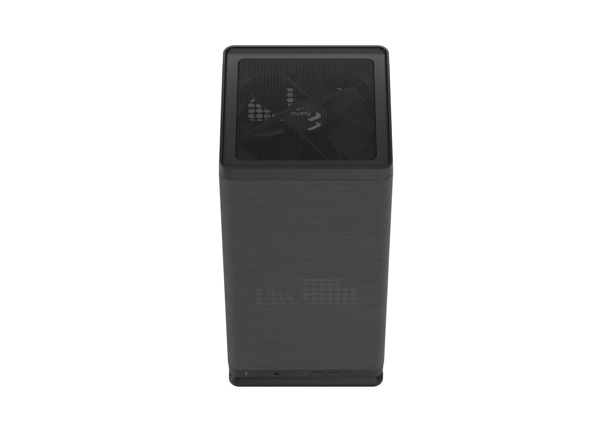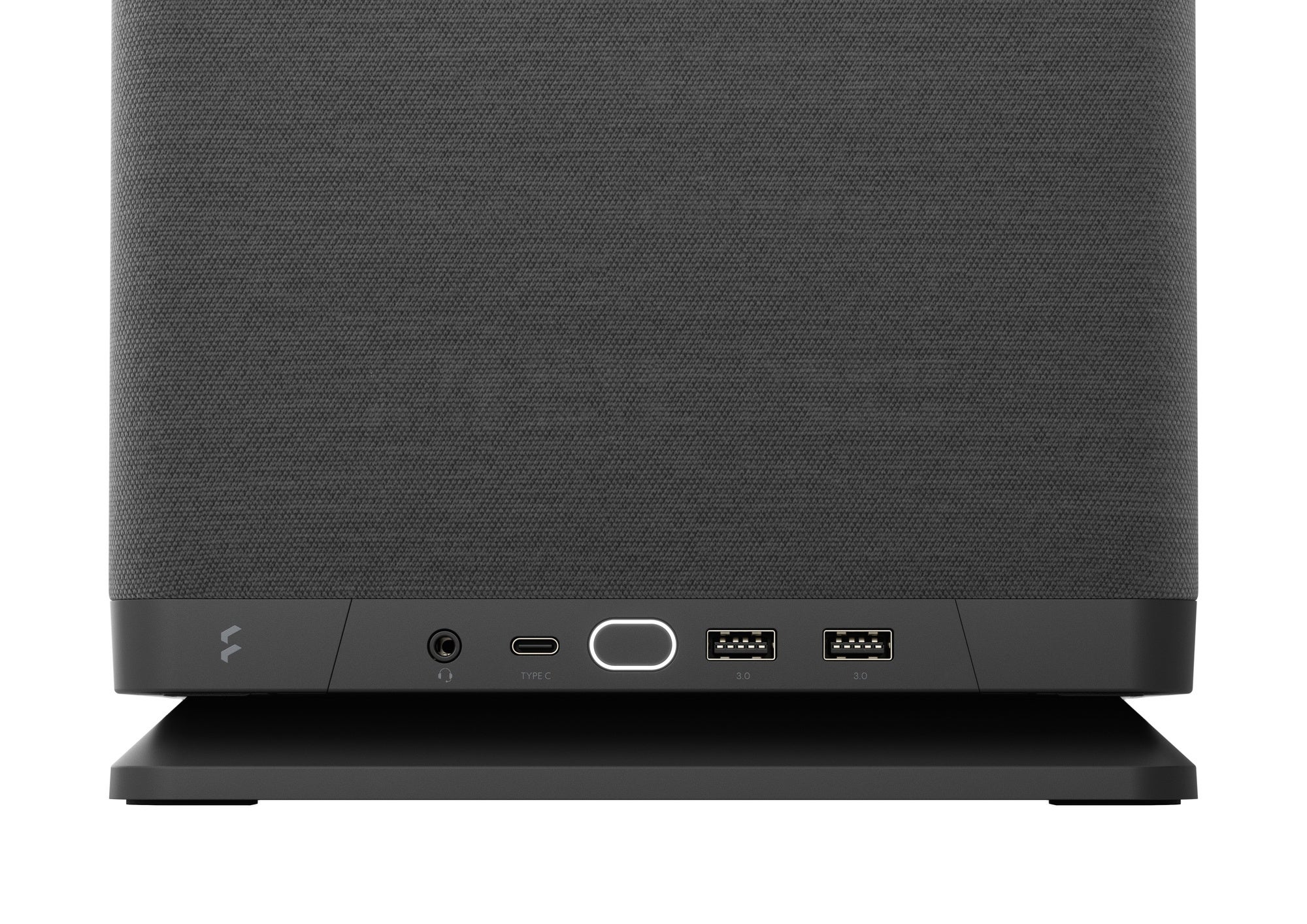 置き場所を選ばない、212×212mmのコンパクトなフットプリント。3面をファブリック素材で覆ったデザインで、あたかもスピーカーのような外観のミニタワー型PCケースです。リビングなどの生活空間にも溶け込み、モダンなインテリアにもマッチします。本体カラーは、ライトグレーとブラックの2色をご用意しております。
