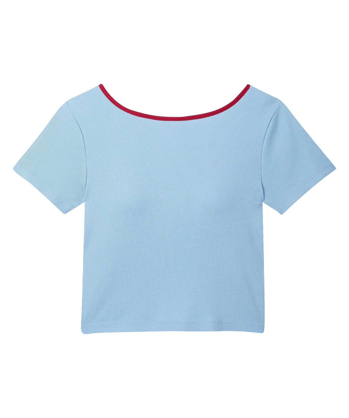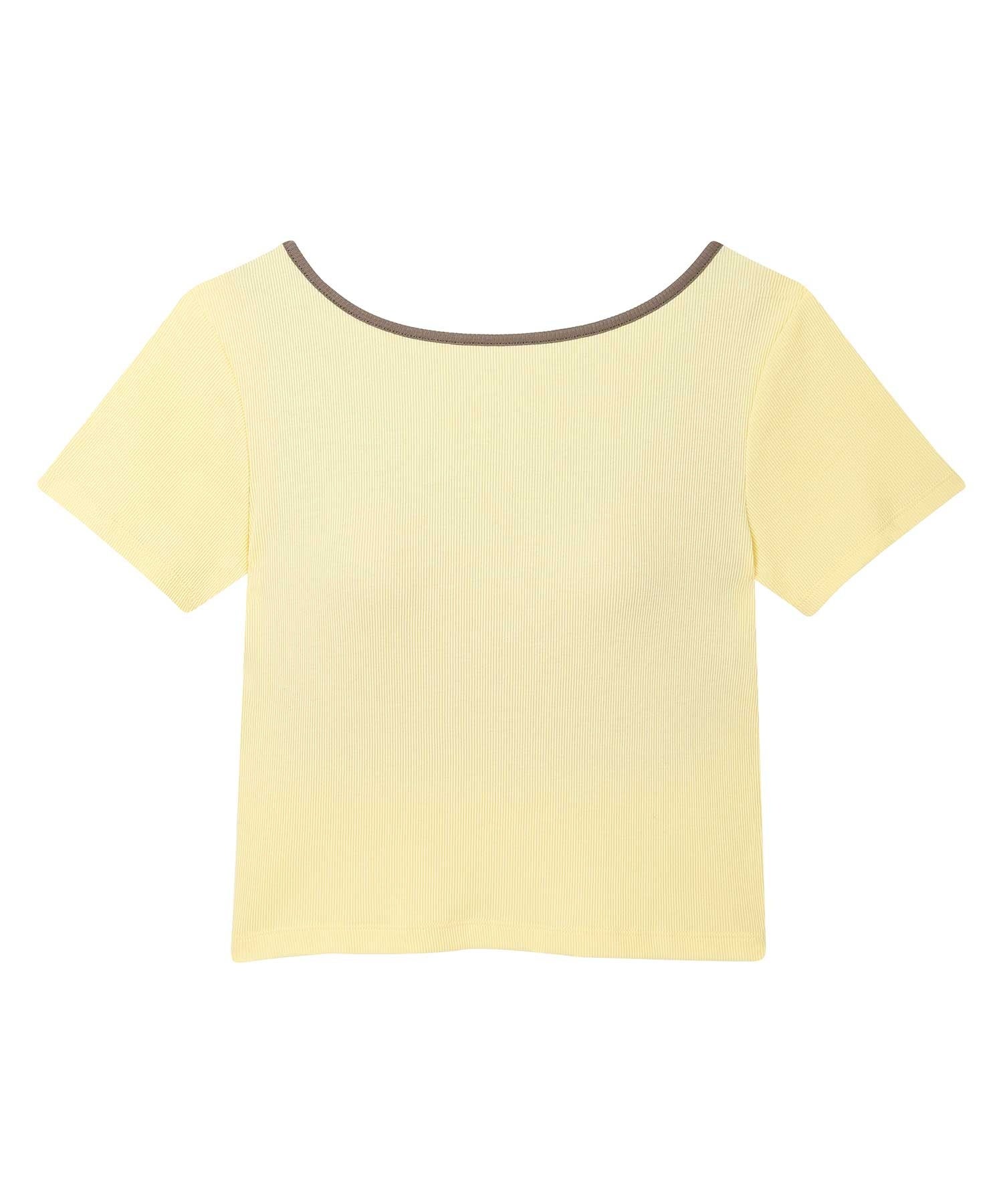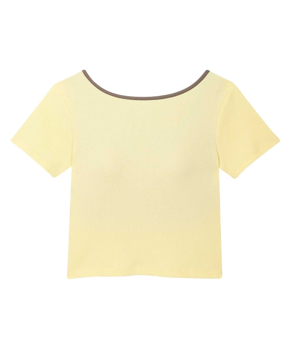 カップがついているから、下着選びに迷いがちなバックオープンスタイルも、これ1枚で着こなしOK。カラーリングにこだわったネックデザインもポイントで、ショート丈なのでさまざまなボトムとコーディネイトできます。