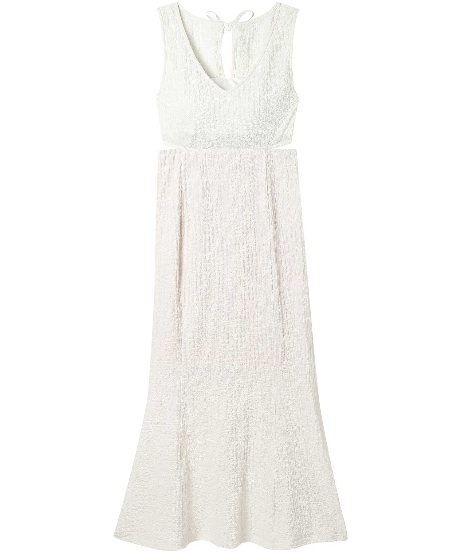 ウエスト部分とバックのスリット開きデザインで、ヘルシーな肌見せに。ポコポコとした表面感のあるシャーリング生地を使用し、やわらかな印象を与えます。