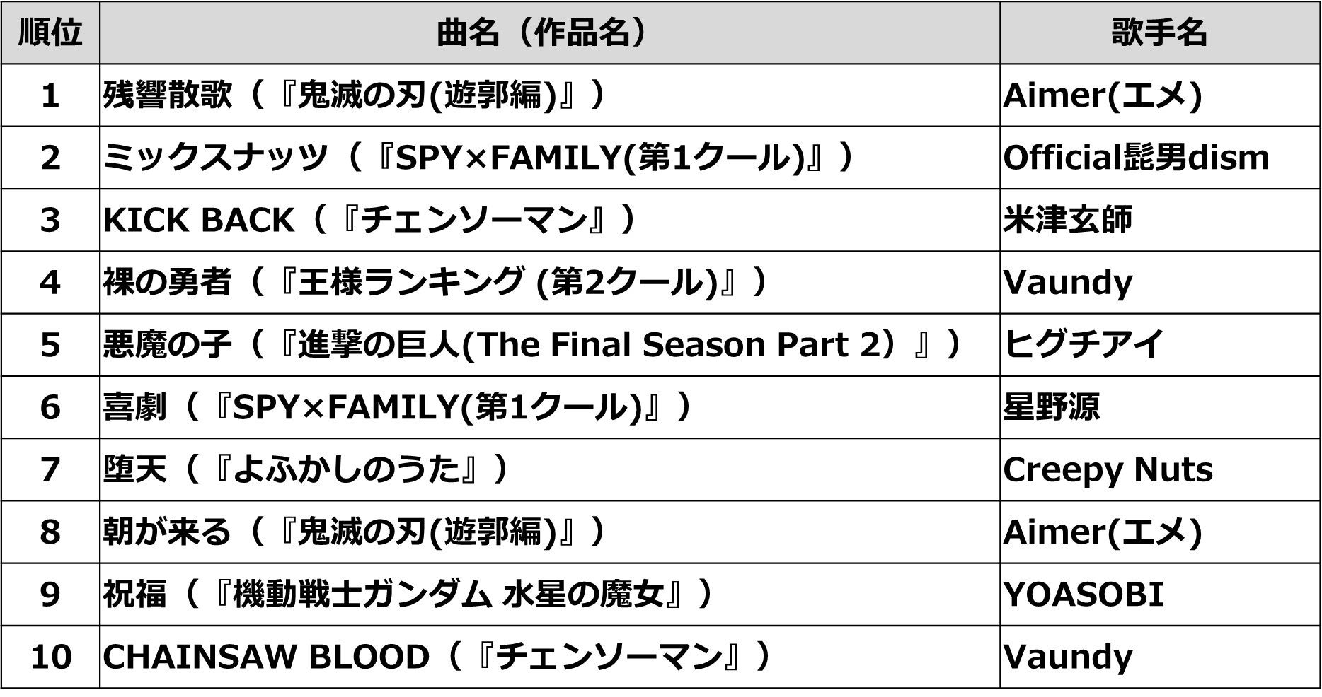 続いて4位は、Vaundyが歌う『王様ランキング (第2クール) 』OPテーマ「裸の勇者」。“歌詞とメロディが作品とマッチする”と、SNSを中心に多くのファンを獲得しました。また、5位には『「進撃の巨人」The Final Season Part 2』EDテーマ「悪魔の子/ヒグチアイ」がランクイン。 “主人公の気持ちを表現している”と、国内外の多くのファンの共感を呼びました。