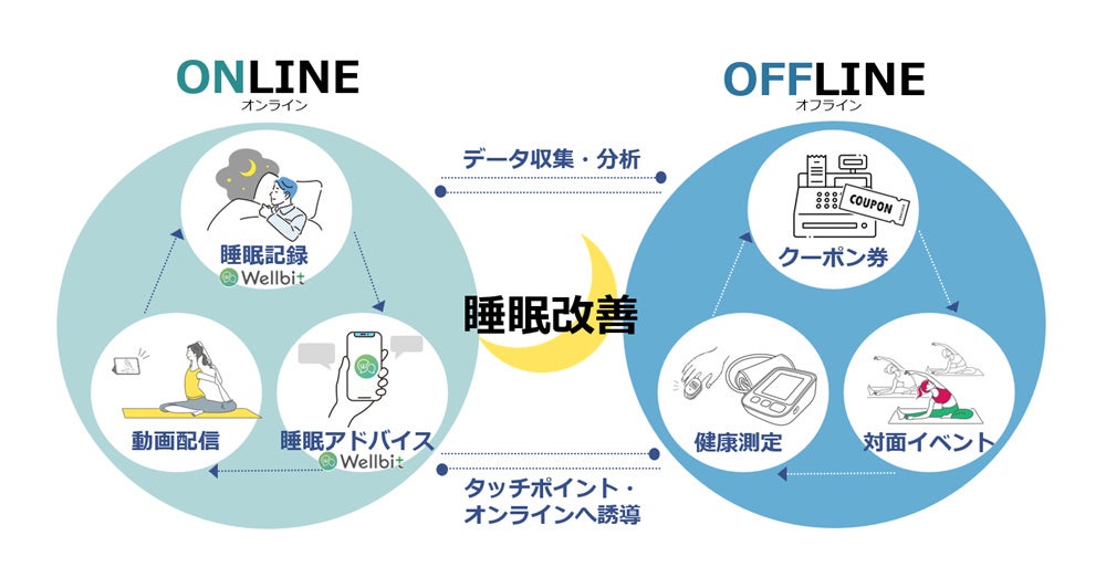 実証実験では、オンラインとオフラインを組み合わせたOMO(注2)手法を用いて、「Wellbit Sleep」の提供をはじめ、駅構内での健康測定やスポーツジムでのリアルイベントの実施などを行いました。「Wellbit Sleep」は、収集した利用者の行動や時系列データを分析し、習慣化させたい対象行動に合ったタイムリーな利用者向けメッセージを生成します。睡眠改善が期待できるヨガや瞑想体験のリアルイベントを実施し、「Wellbit Sleep」内でヨガ・瞑想の睡眠効果を伝えるリテラシーのメッセージ配信や、アプリ内でのヨガ・瞑想動画の配信を組み合わせることで、利用者の睡眠改善の行動変容効果の向上を目指しました。