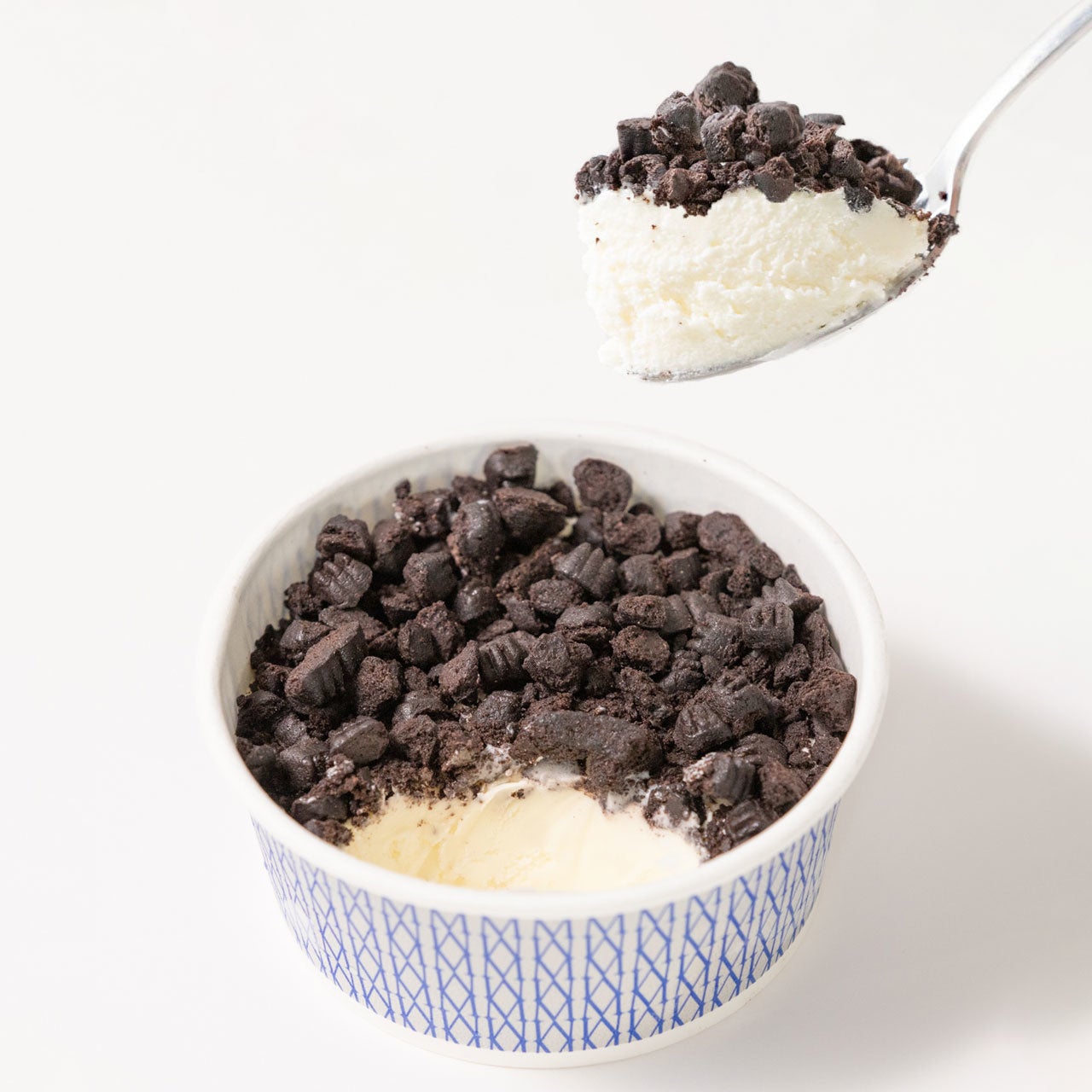 「MOW PRIME(モウ プライム)クッキー&クリーム」は、北海道産のマスカルポーネチーズを使用したコク深いバニラアイスと、相性の良さにこだわって開発した、ビターで香ばしいココアクッキーをトッピングした商品です。冷凍庫から出してすぐ召し上がる場合は、濃厚なバニラアイスと具材感のあるココアクッキーのマリアージュをお楽しみいただくことができ、少し溶けてきた頃にはアイスとココアクッキーをぐるぐると混ぜ合わせて食べるなど、2通りの食べ方をお楽しみいただけます。