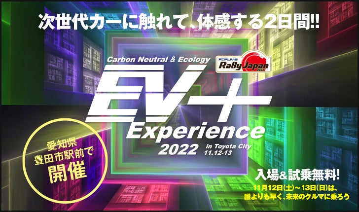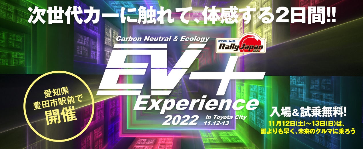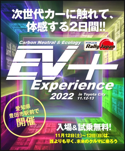 このイベントは、12年振りに日本で開催されるWRC(世界ラリー選手権)をさらに盛り上げるため、フォーラムエイト・ラリージャパン2022(愛知県・岐阜県)と同じ週末の土・日2日間開催となります。WRCは本年度からRally1という次世代のハイブリッドマシンへとスイッチして環境により配慮したカテゴリーへと進化しており、『EV+ Experience 2022 in Toyota City』は、カーボンニュートラル&エコロジーを実現した“新時代の自動車体感イベント”として展開します。