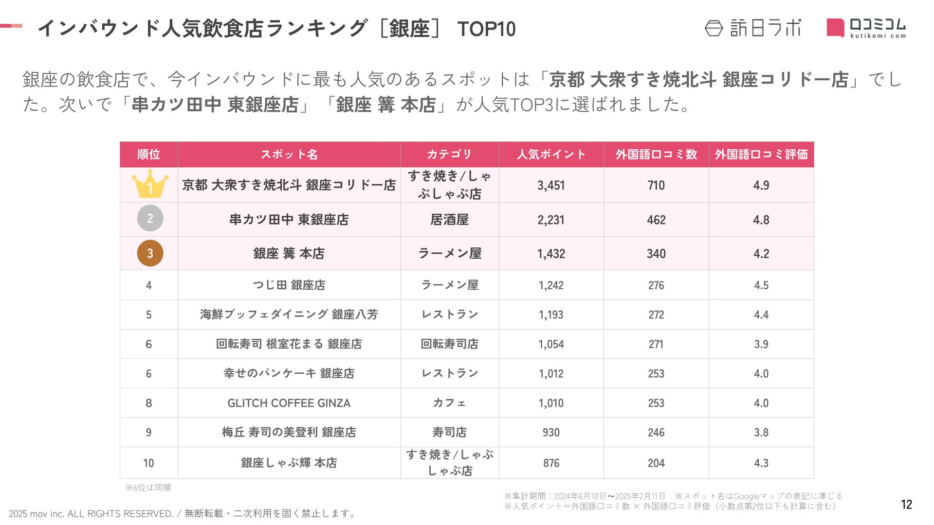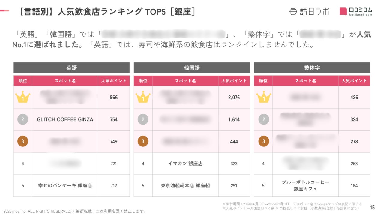 業界最大級のインバウンドビジネスメディア「訪日ラボ」及び 店舗向け集客一元化プラットフォーム「口コミコム」を運営する株式会社mov(代表取締役:渡邊 誠、本社:東京都渋谷区、以下mov)は、銀座エリアの飲食店に寄せられた最新の口コミデータから、独自の『インバウンド人気観光地ランキング』を発表しました。