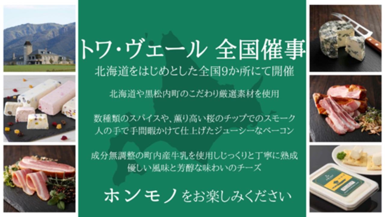 SDGs販促を推進するインパクトホールディングス株式会社 (東証グロース・証券コード:6067) の完全子会社で、人材サービス事業およびまるごと催事事業 (催事企画・運営) を展開している株式会社サツキャリ (本社:北海道札幌市中央区、代表取締役社長:川田 孝、以下「当社」) は、2023年4月21日(金)より、くるるの杜を皮切りに北海道黒松内町の 「トワ・ヴェール」 からチーズ、ハム、ソーセージなど 「大自然のおいしさ」 をお届けする催事を全国9店舗で開催いたします。 北海道の豊かな大自然で育まれた銘品をこの機会に是非お買い求めください。