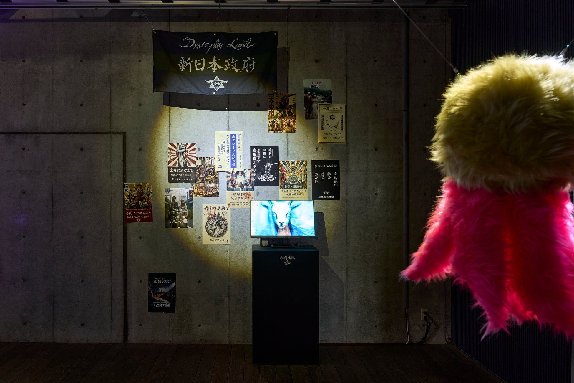 展覧会では、突然変異で一つ目に生まれたヤギを信仰する教団のイメージビデオ、苦難を生き抜いた市民たちによる民謡を踊り歌い続けるロボット、見たこともない生物など、奇想天外な未来の世界が描かれます。ディストピアの世界となったパラレルワールドを通して、人類の愚かさ、過去の厄災や困難を乗り越えてきたしぶとさを示し、より良い未来を共に考える場を創出します。