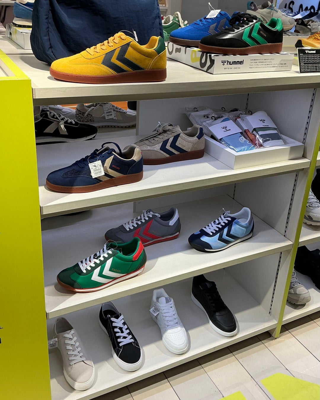 婦人くつ売り場ながらも、MENSコーナーも。ユニセックス展開するヒュンメルは、男女どちらにも対応します。