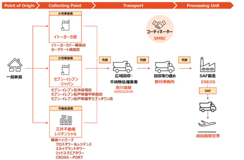 ・セブン‐イレブン・ジャパン 店舗での家庭からの廃食用油回収 ・イトーヨーカ堂 店舗での家庭からの廃食用油回収 ・三井不動産レジデンシャル 「幕張ベイパーク」内大規模分譲マンションでの居住者からの廃食用油回収 ・三井住友銀行 プロジェクトコーディネート ・吉川油脂 廃食用油回収、運搬、リサイクル、ENEOSへの引渡し ・野村事務所 廃食用油の回収取り纏め ・ENEOS 回収された廃食用油からSAFを製造(2027年以降) 回収された廃食用油の海外への販売・海外からのSAF輸入 |