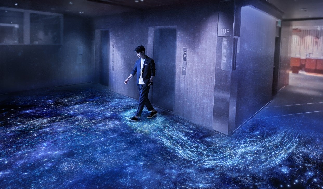 チェックインが集中する時間帯には、足元に天の川のような星々が流れる「星空」コンテンツへと切り替わります。星の演出がお客様をロビーへと自然に誘導し、視覚的な美しさとともに、スムーズな動線を生み出します。