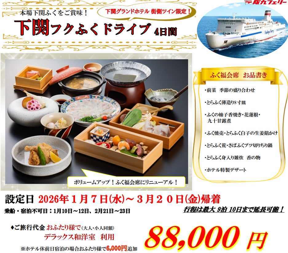 〇商品名 『本場下関ふくをご賞味!下関フクふくドライブ4日間』