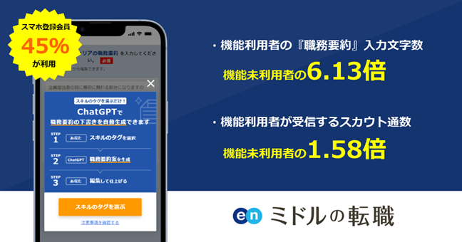 機能搭載から約半年(2024年1月段階)で、スマホ登録会員の45%が利用。機能利用者は、機能未利用者と比較して「職務要約」項目の入力文字数が約6倍。スカウト受信数が1.58倍と、ミドル人材の転職活動において効果が発揮されております。
