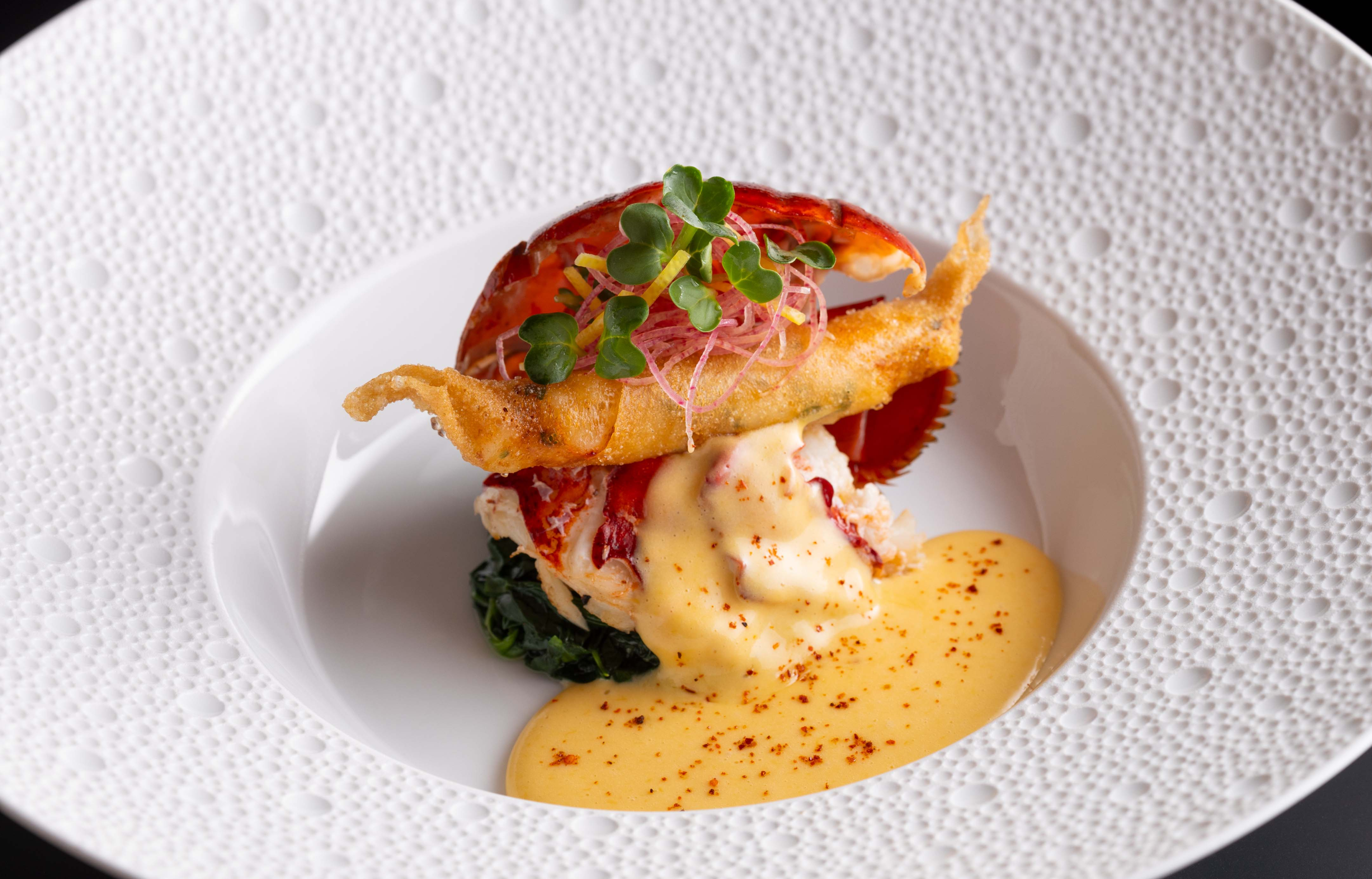 オマール海老の香ばしさがより引き立つよう、クラシックなオランデーズソースを軽やかに仕上げ合わせました。リコッタチーズとオマール海老を包んだパピヨット仕立てのフリットの食感と共にお楽しみください。