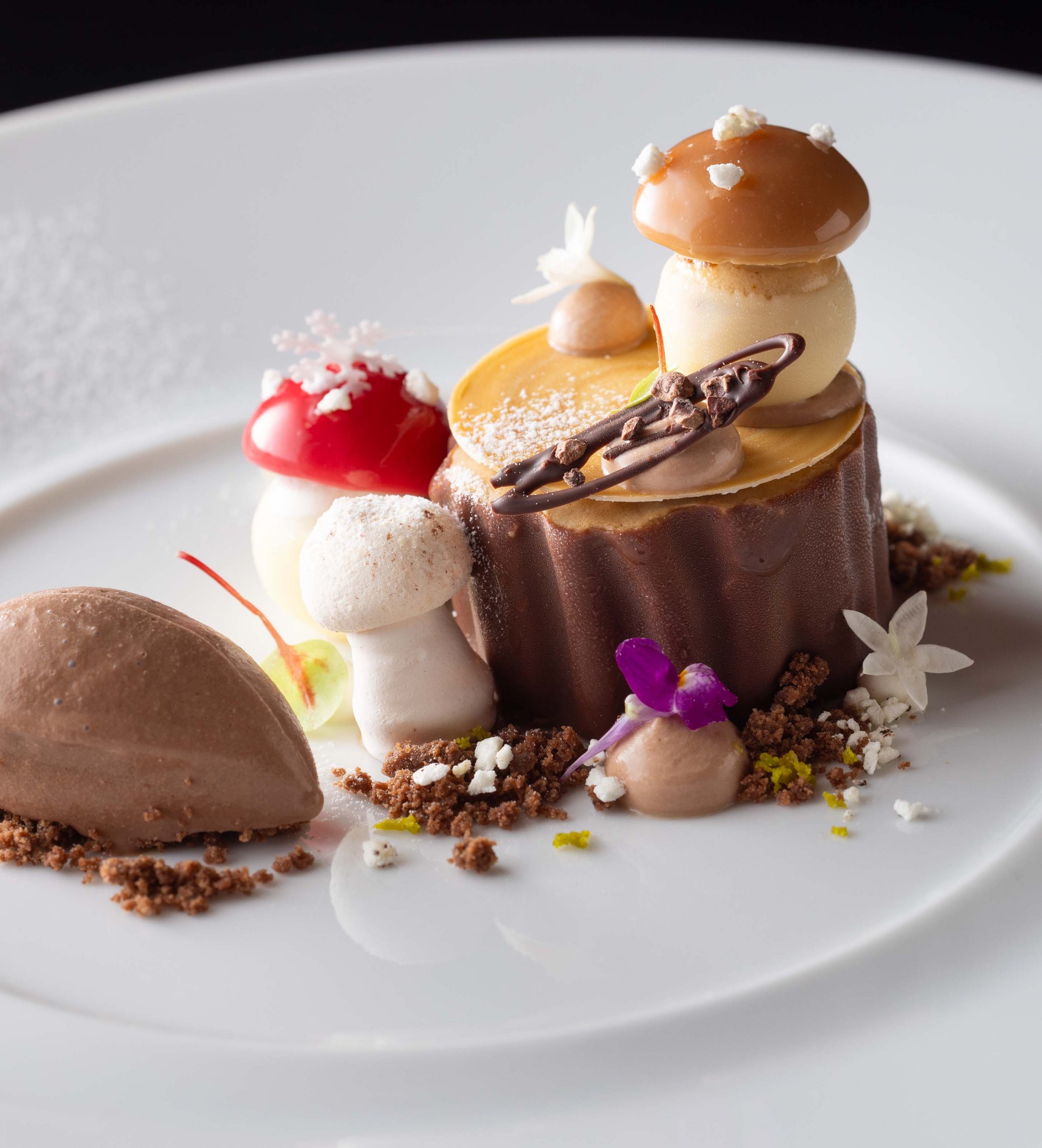 ヘーゼルナッツのムース、チェリーのムースで仕上げた2種類の可愛らしいきのこがアクセントになっています。