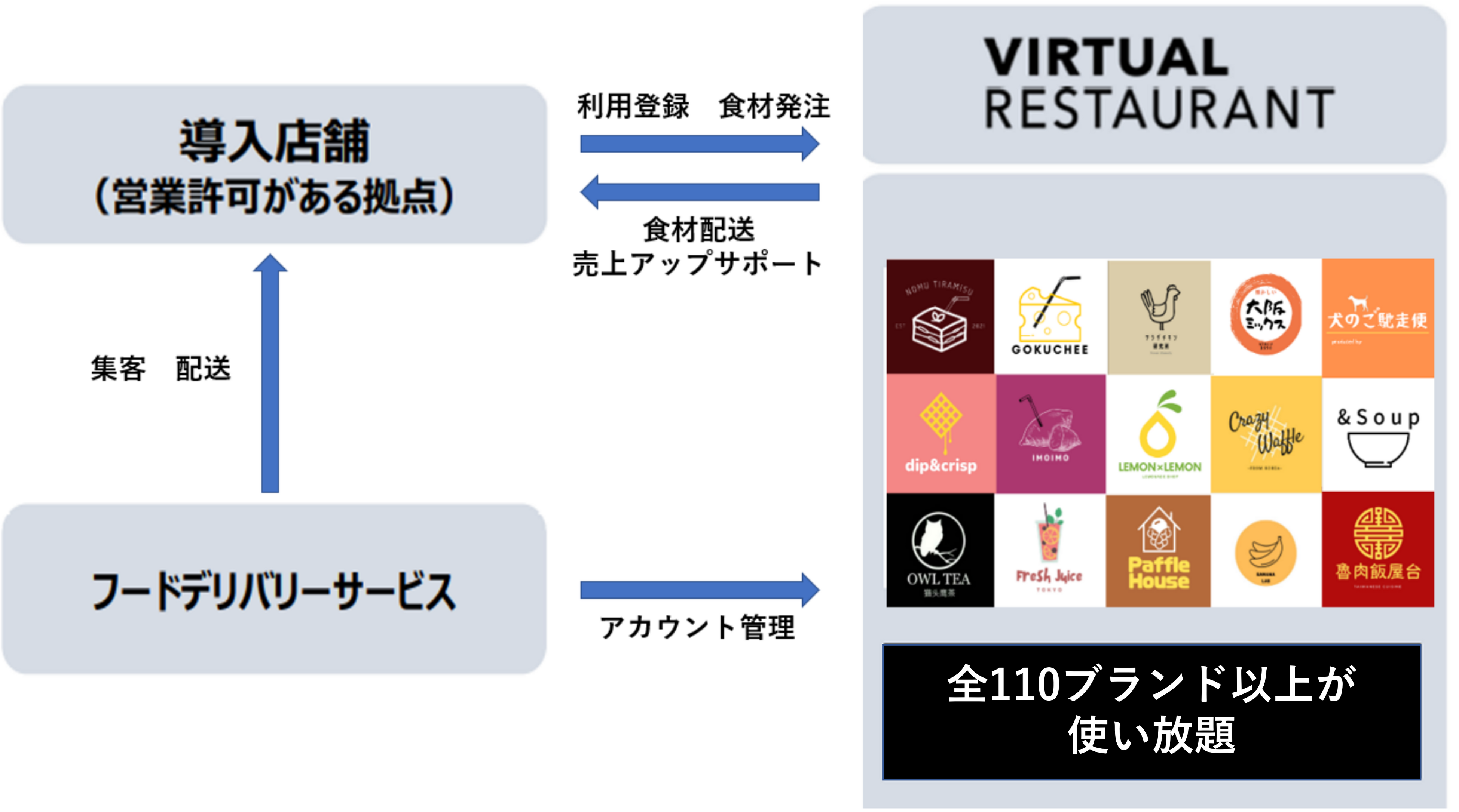 飲食店が通常のイートイン営業と並行して、デリバリープラットフォーム上で別業態の店舗を構える仕組みで、営業許可があれば開業可能です。既存の設備や人材を活用するため、新たにコストを割く必要がなく、効率よく実店舗+αの利益を得ることができます。
