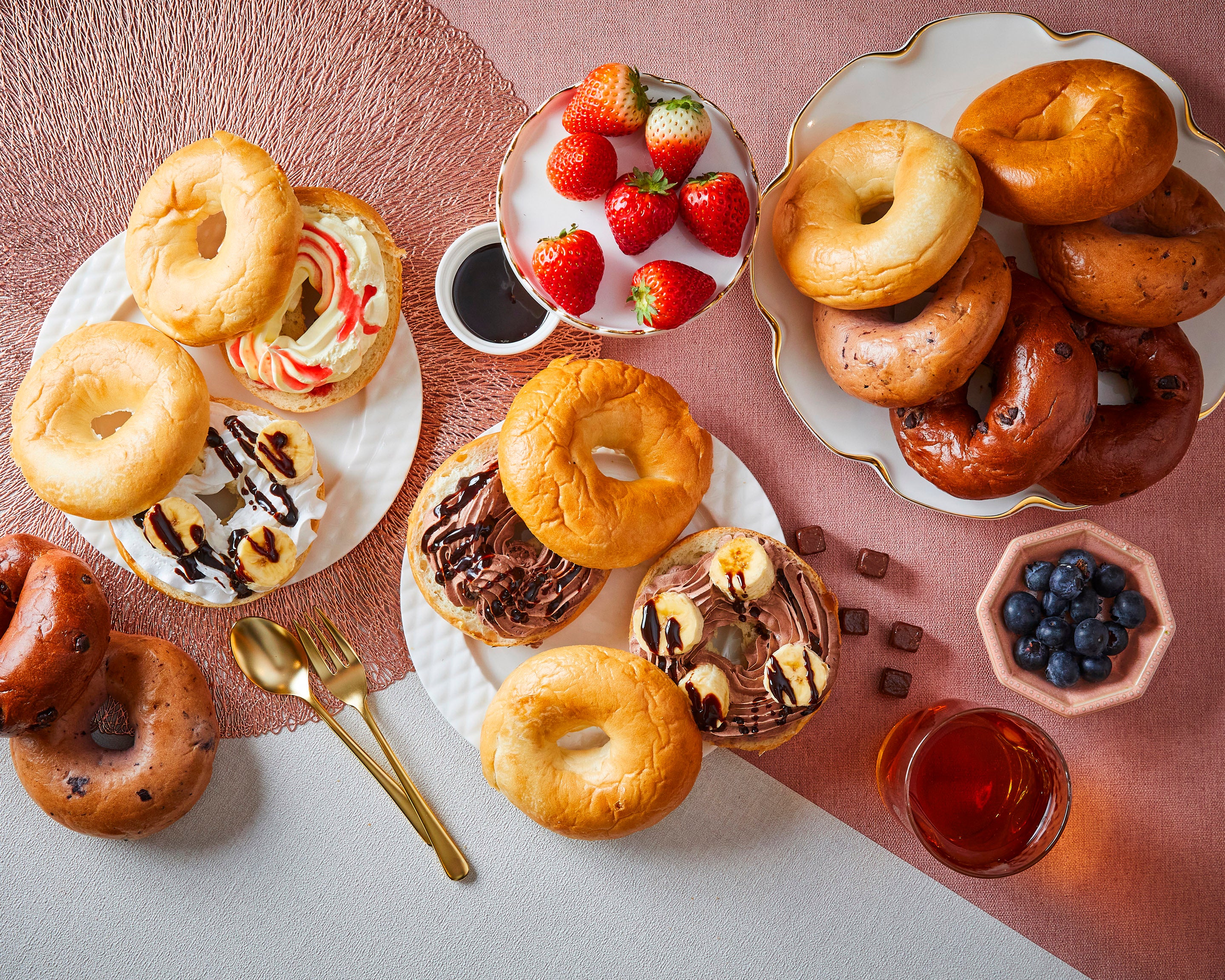 もっちりベーグルに濃厚な甘さのクリームを挟んだデザートベーグルです。3種のベーグル(プレーン、チョコレート、ブルーベリー)と21種のクリーム(王道のホイップクリーム、濃厚チョコレートホイップ、大人な甘さのマスカルポーネクリームなど)を組み合わせてお好きな味をお選びいただけます。