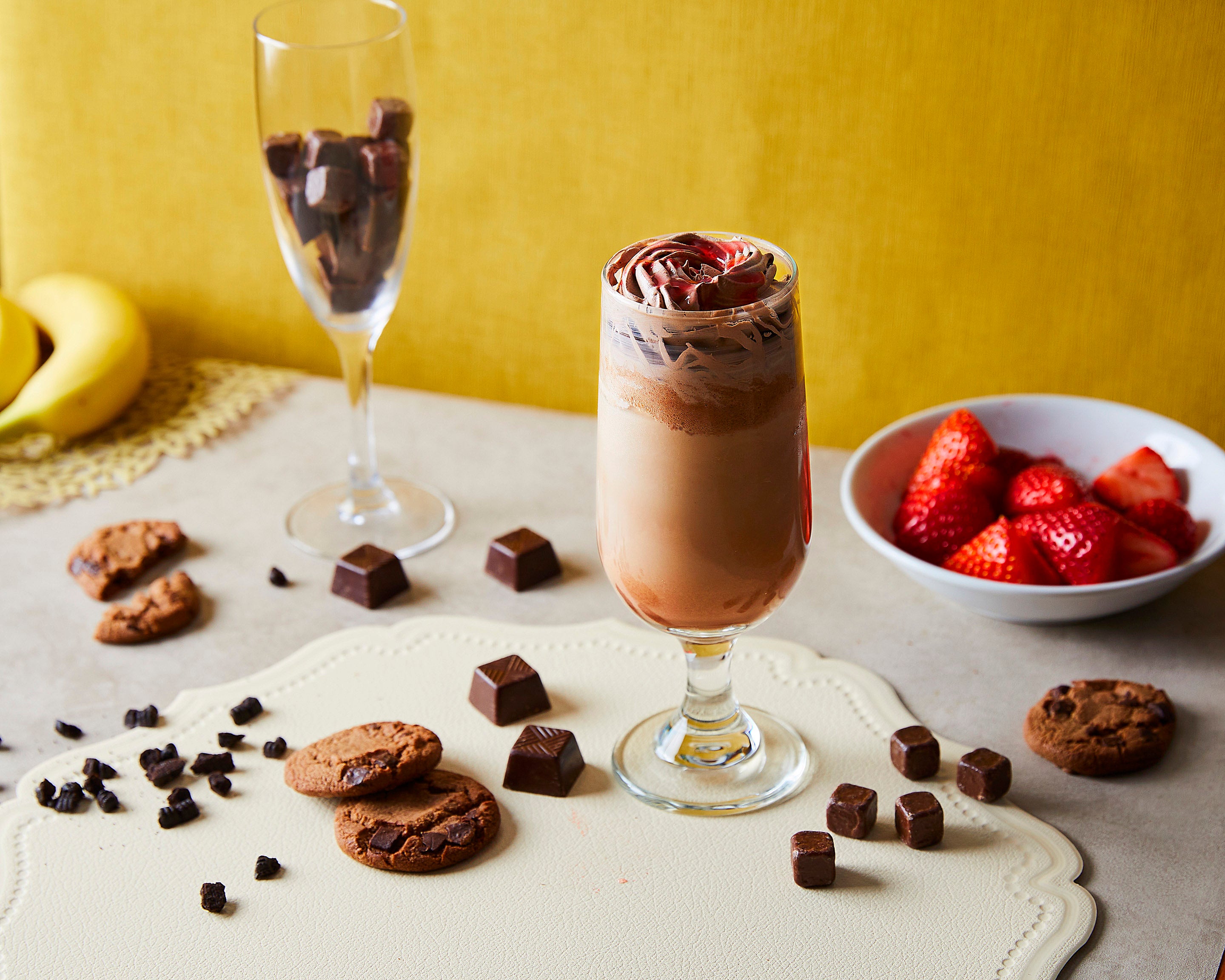 ビターチョコレートのほろ苦さと深みを表現した、ちょっと大人のチョコレートドリンクです。クリームをのせ、より濃厚に仕上げました。ベリーを加え酸味をアクセントにした「飲むショコラ×ベリー・ベリー」やバナナの甘さを加えた「飲むバナナショコラ」もおすすめです。