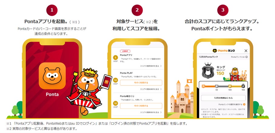 本プログラムは、必須条件である「Pontaアプリの起動」と、対象となるPontaサービスの利用などの条件達成によって、同月内に獲得したスコアに応じてランクが決定します。ランクに応じた特典として、毎月Pontaポイントをプレゼントします。