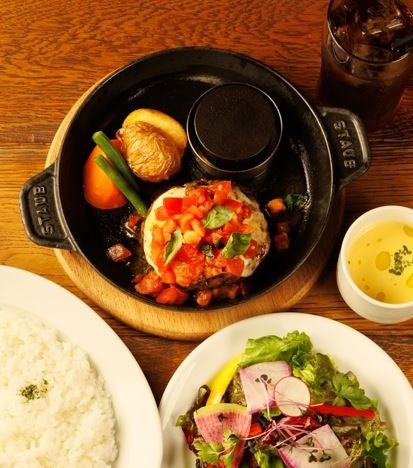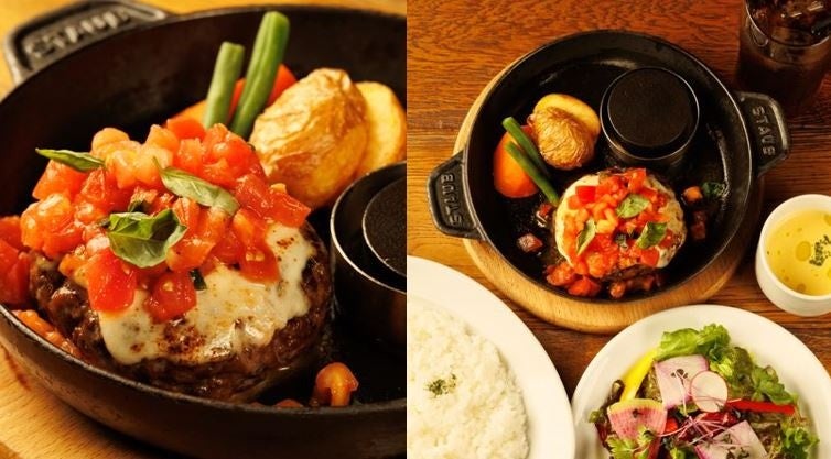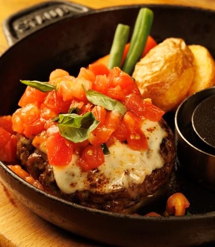 お店で挽きたての国産牛100%ハンバーグにとろけるモッツァレラとバジルの香るフレッシュトマトソースの爽やかなハンバーグステーキ!チーズのコクとトマトの酸味、バジルの香りが相性抜群!