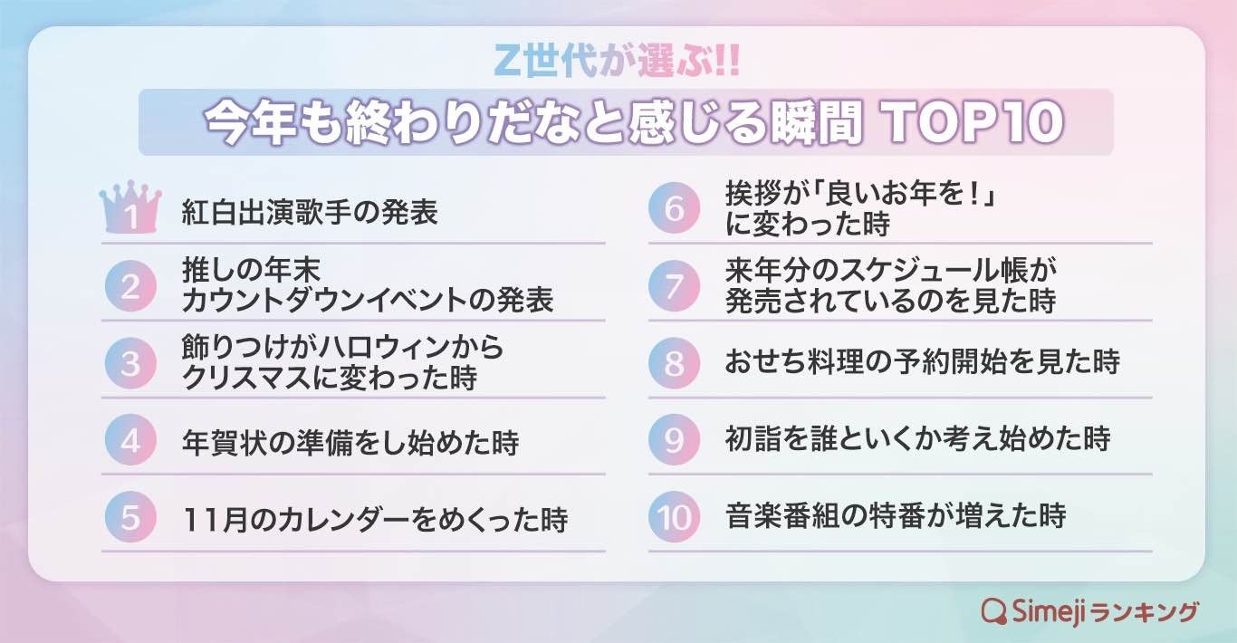 【Simejiランキング】Z世代が選ぶ!!「今年も終わりだなと感じる瞬間TOP10」
