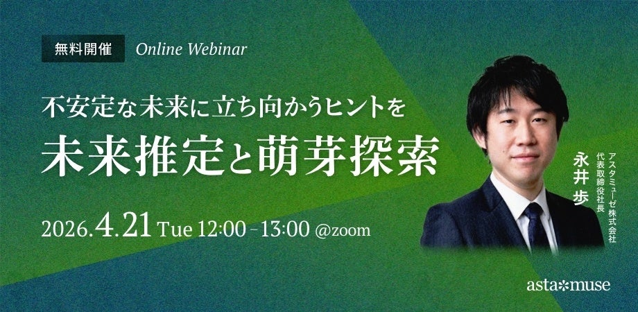 アスタミューゼ株式会社(本社:東京都千代田区、代表取締役社長 永井歩)は、2026年4月21日(火)12:00-13:00に、無料ウェビナー「不安定な未来に立ち向かうヒントを ~未来推定と萌芽探索~」を再開催いたします。