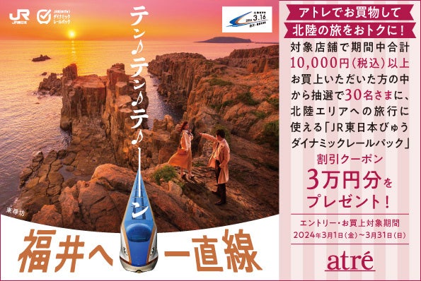 JRE POINT WEBサイトからエントリーの上、アトレの対象店舗で期間中合計10,000円(税込)以上JRE POINTが貯まるお買いものをされた方の中から抽選で30名さまに、北陸エリアへの旅行に使える「JR東日本びゅうダイナミックレールパック」割引クーポン30,000円分をプレゼント!