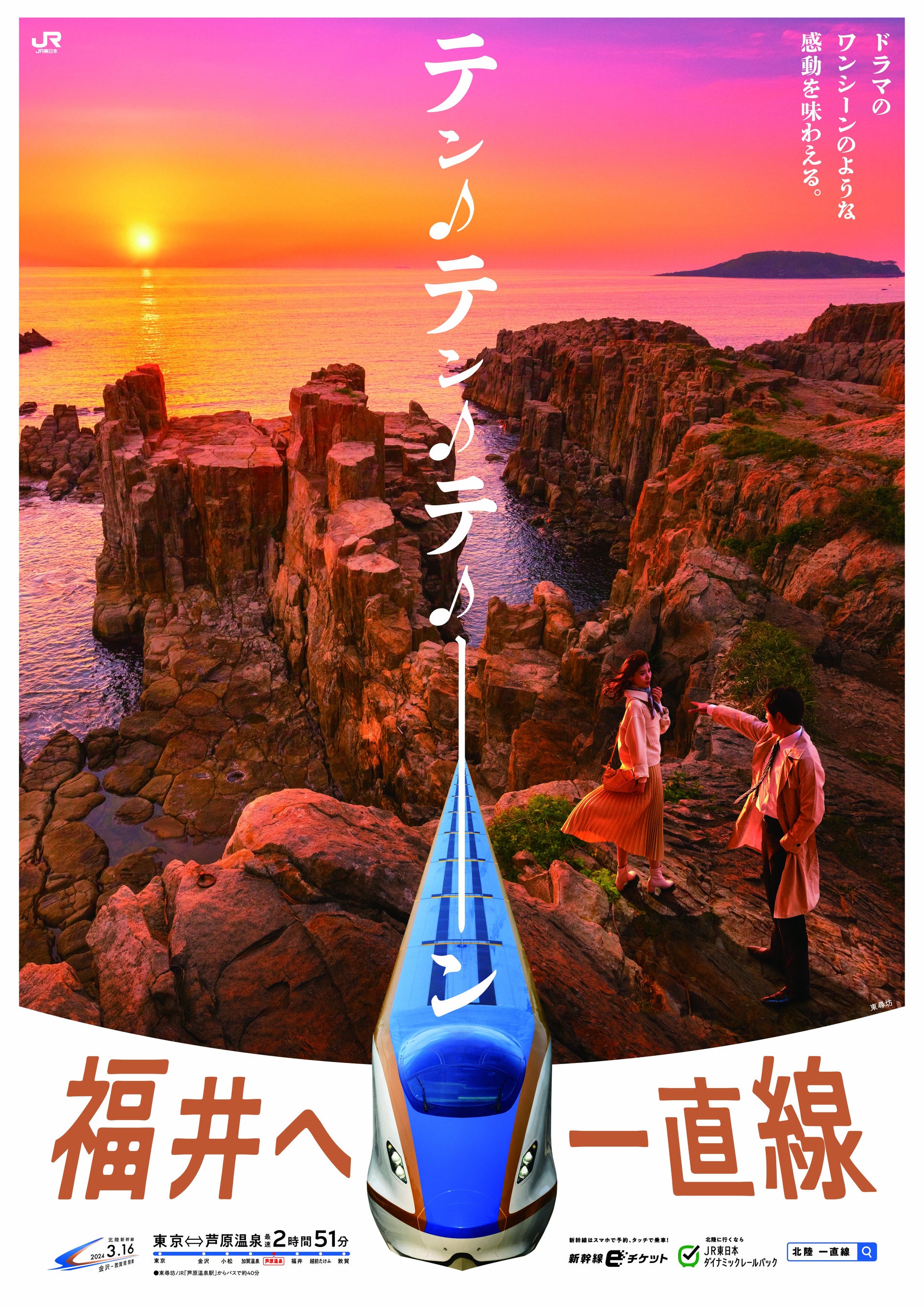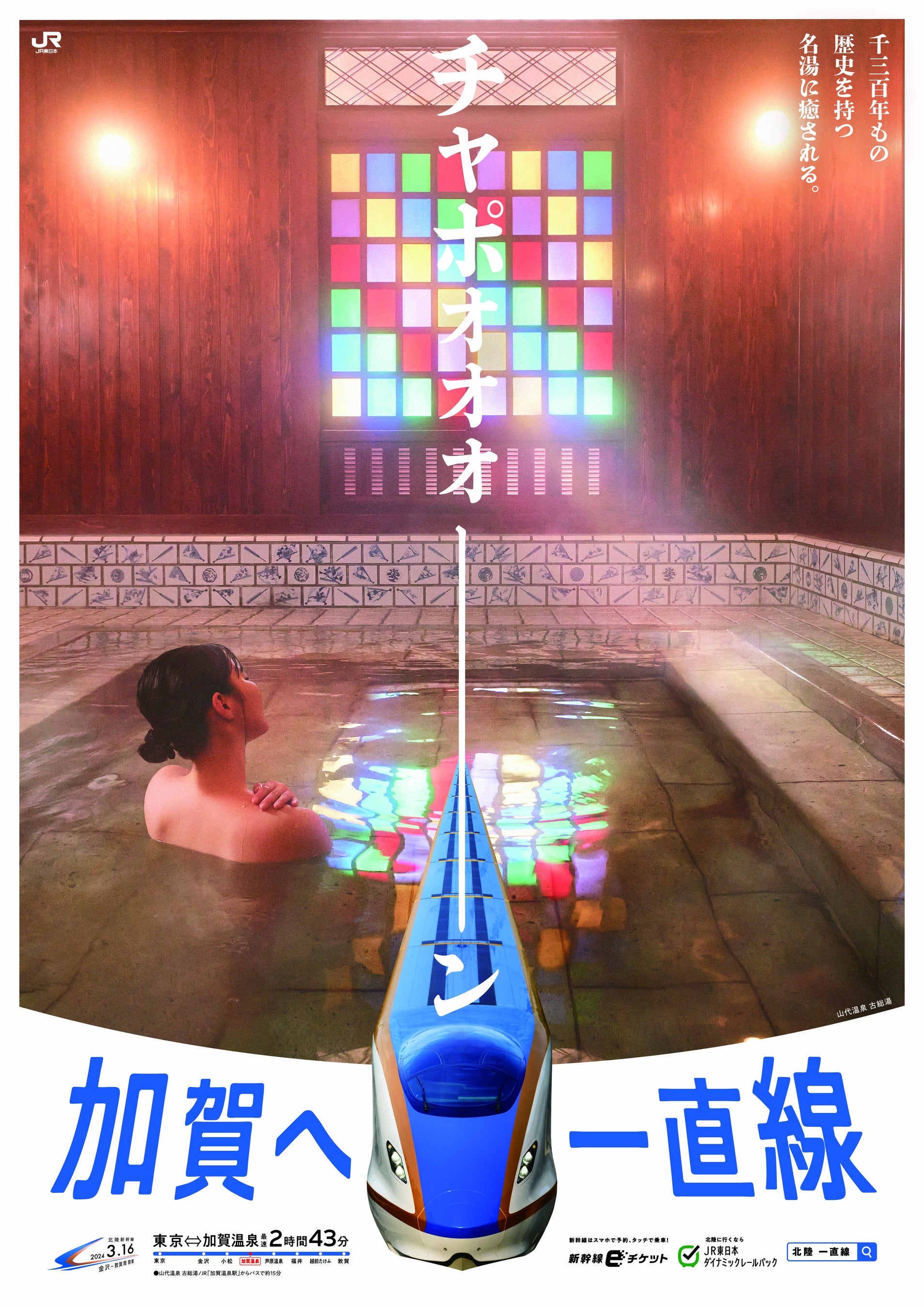 福井県の観光素材として恐竜と東尋坊、加賀エリアは山代温泉の古総湯を使用し、画面中央に大きく伸びたオノマトペとE7系新幹線を配置して、視覚的に強く『一直線』を感じられるレイアウトにしています。また、各素材を味わっていただく際に聞こえてきそうなオノマトペにより、視覚だけでなく聴覚でも楽しむことができるポスターをJR東日本の各駅で掲出します。
