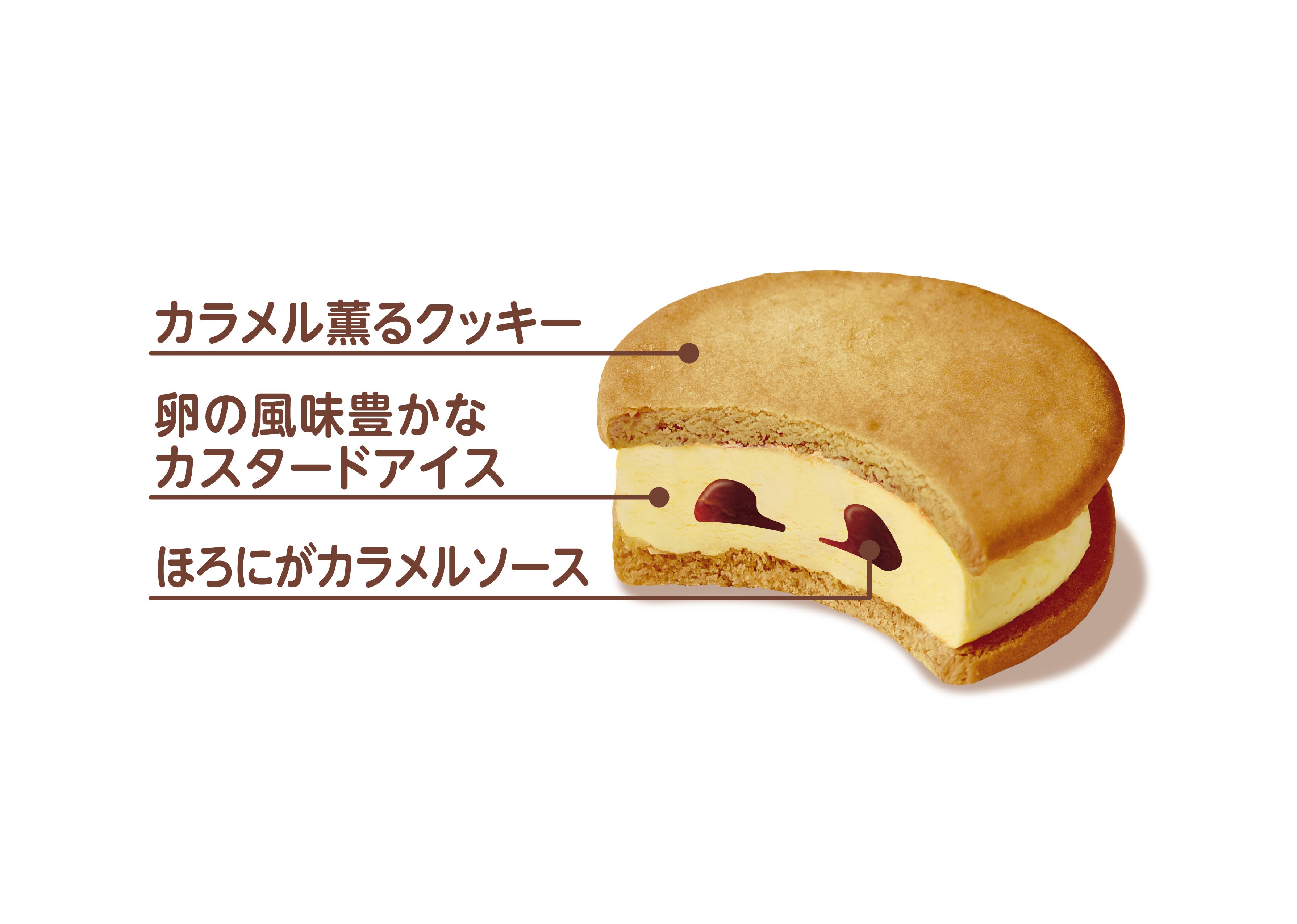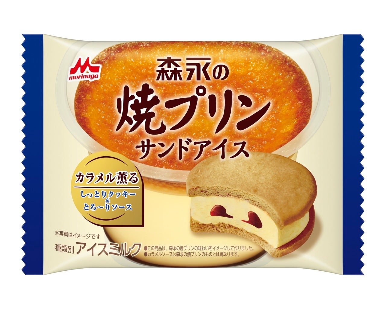 ①卵の風味豊かなカスタードアイスをカラメルが薫るクッキーで挟んだ、森永乳業のロングセラー商品「森永の焼プリン」の味わいをイメージしたサンドアイスです。