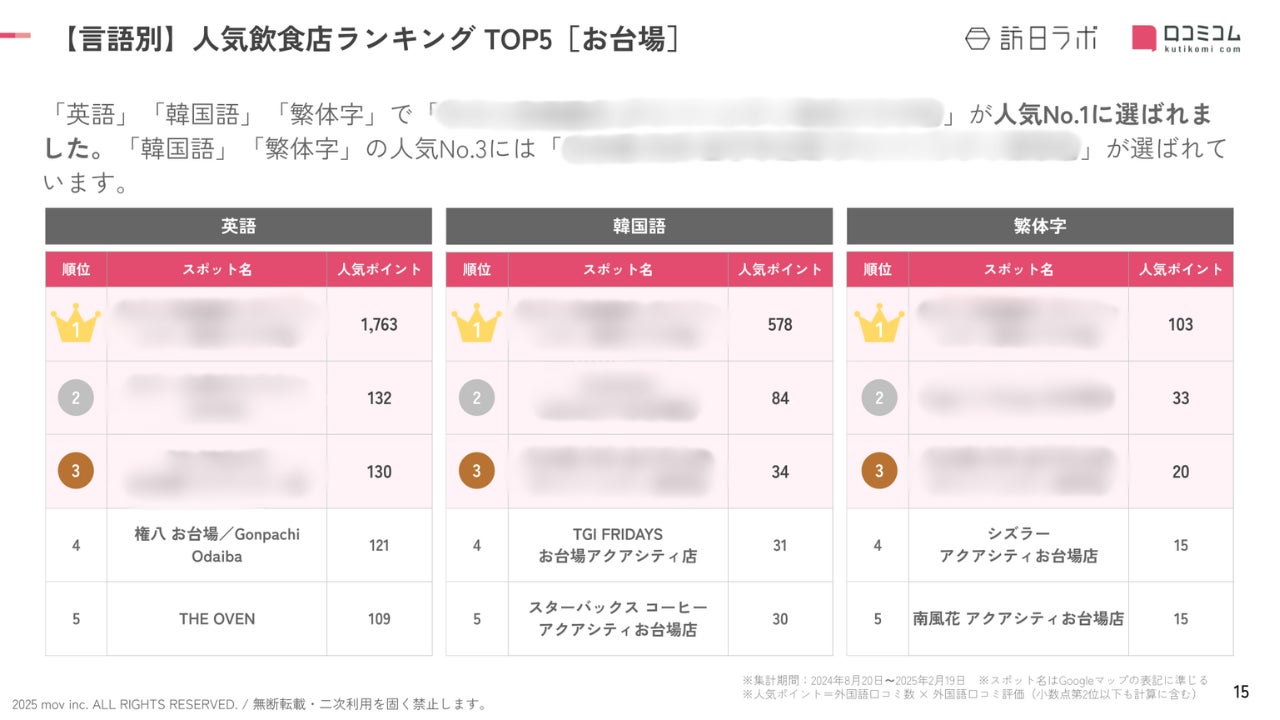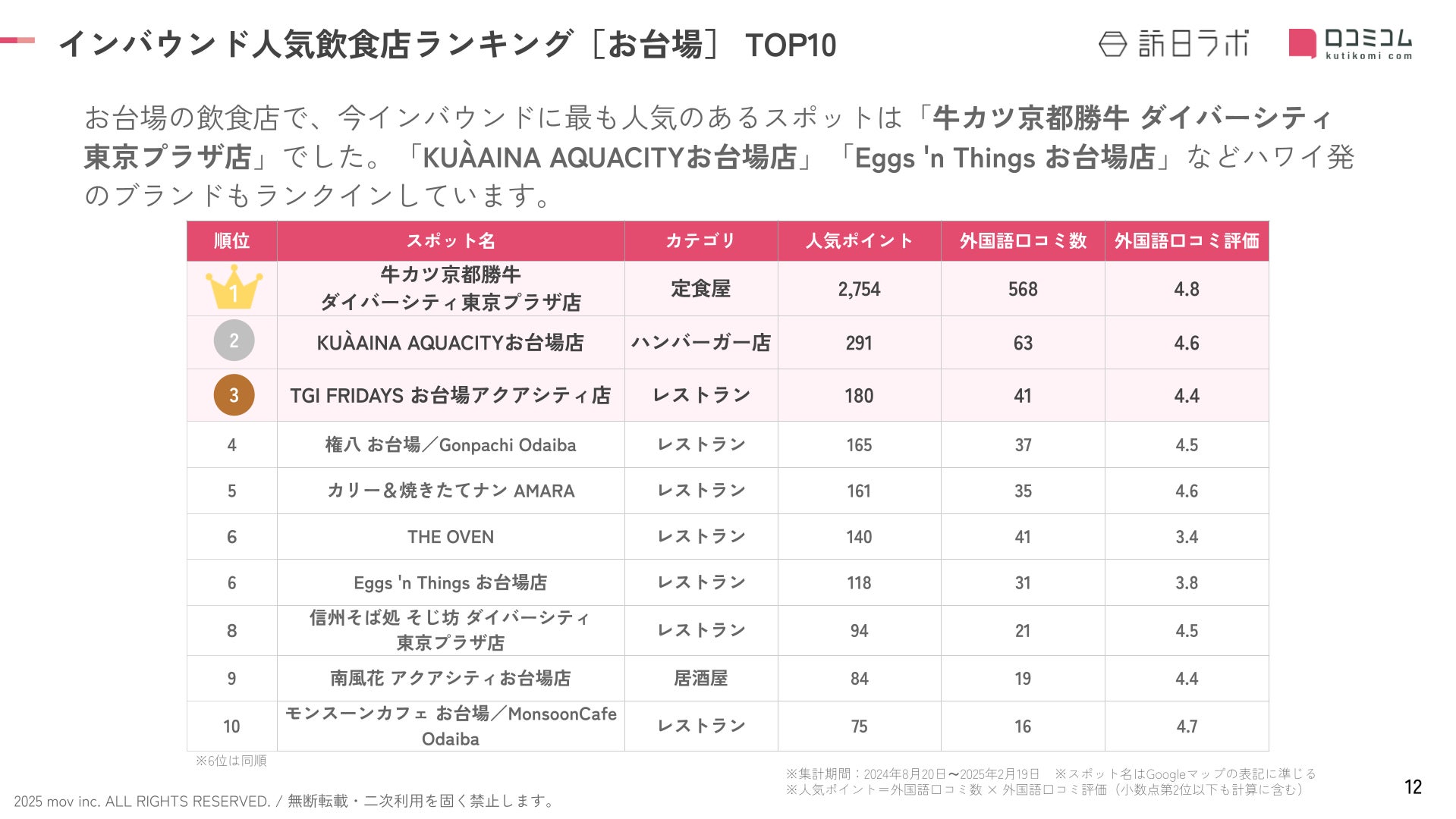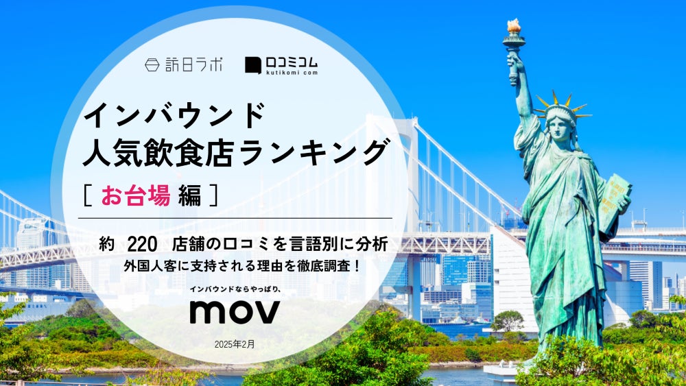 業界最大級のインバウンドビジネスメディア「訪日ラボ」及び 店舗向け集客一元化プラットフォーム「口コミコム」を運営する株式会社mov(代表取締役:渡邊 誠、本社:東京都渋谷区、以下mov)は、お台場エリアの飲食店に寄せられた最新の口コミデータから、独自の『インバウンド人気観光地ランキング』を発表しました。