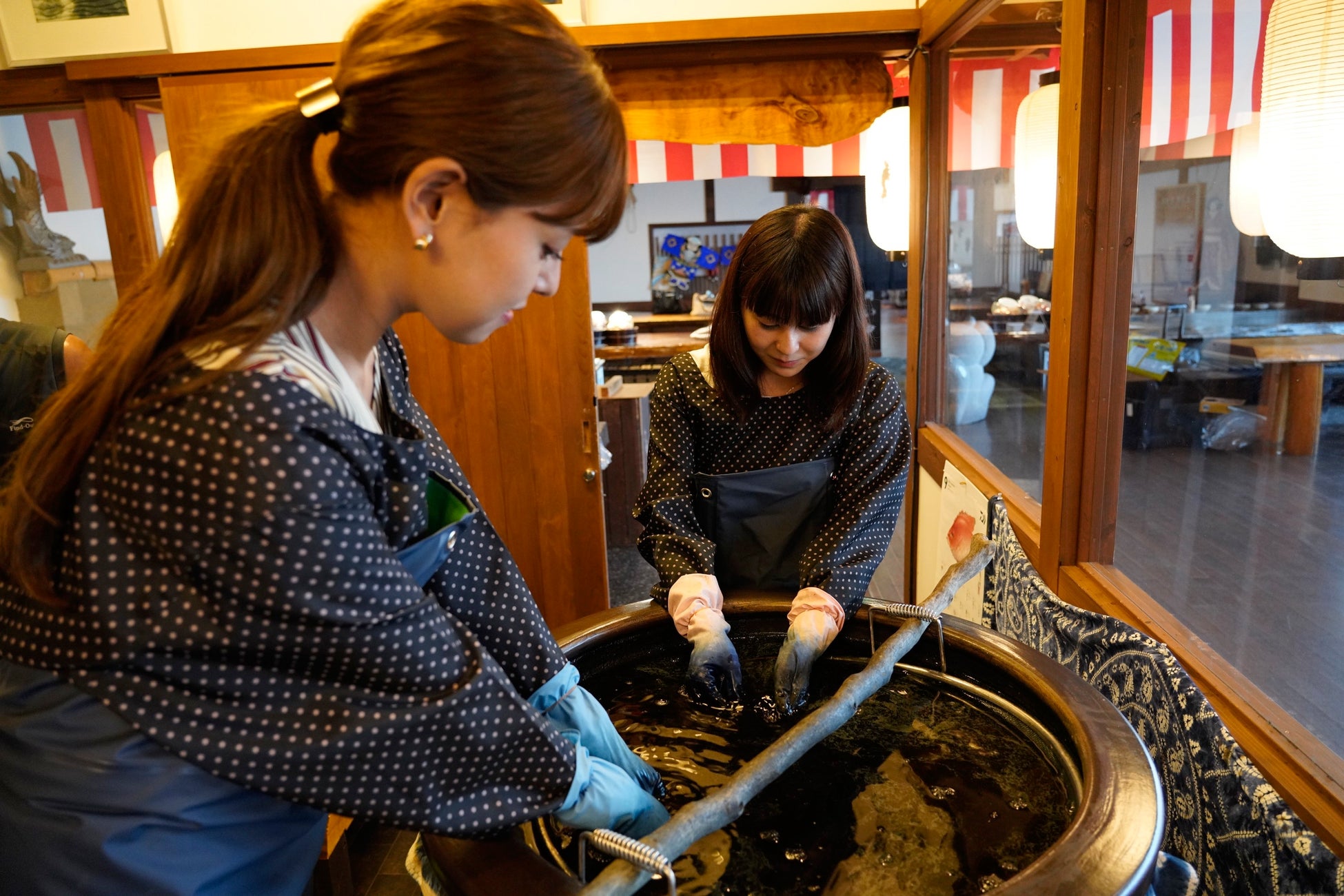 縁日あそびと伝統文化体験「阿波の國」では、藍染めを滞在中にお楽しみいただけるように藍甕を管理。天然灰汁発酵建て阿波藍染めで、ハンカチ(約90分:1,650円~)やコットンバック、Tシャツを染めて、その魅力にふれてはいかがでしょう。その他、大谷焼の絵付け(1,500円~)、阿波手漉き和紙(1,500円)などのプログラムも好評です。https://www.aoawo-naruto.com/publics/index/52/#block3677