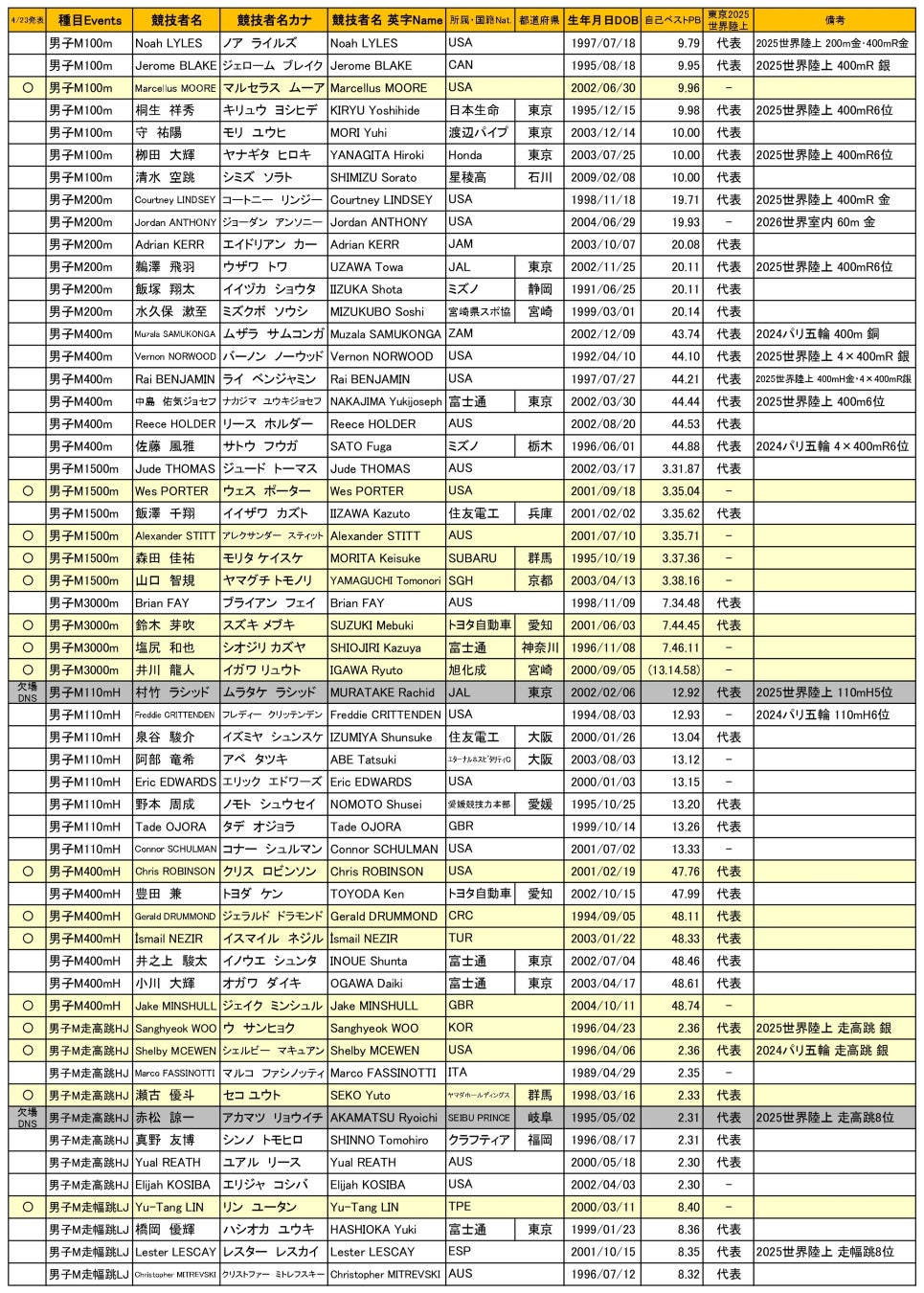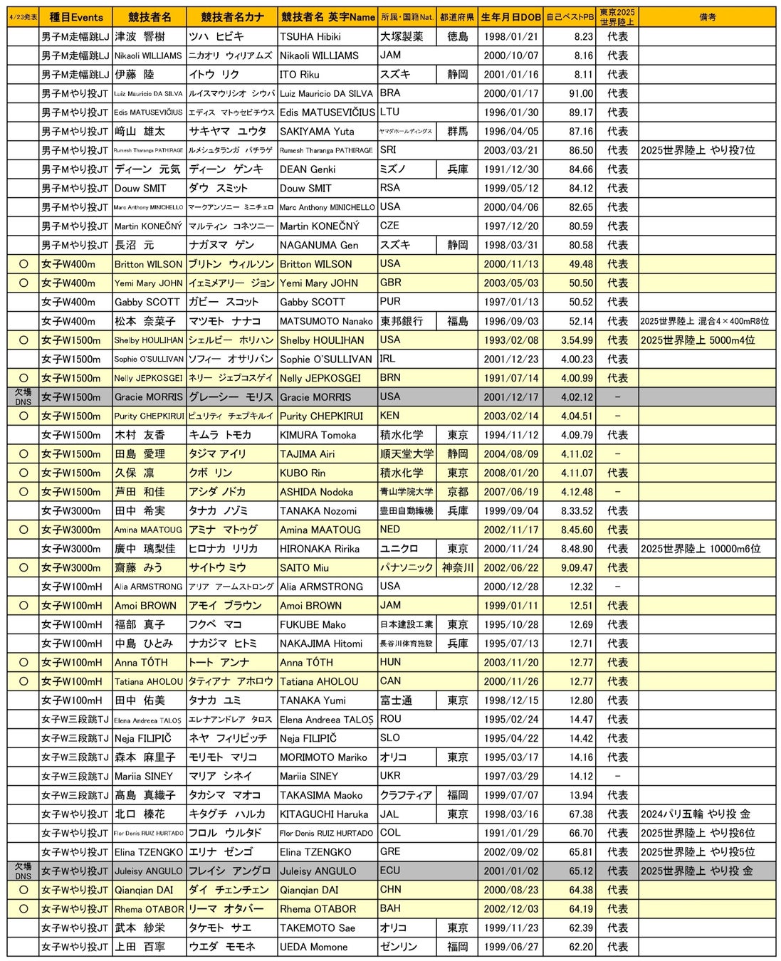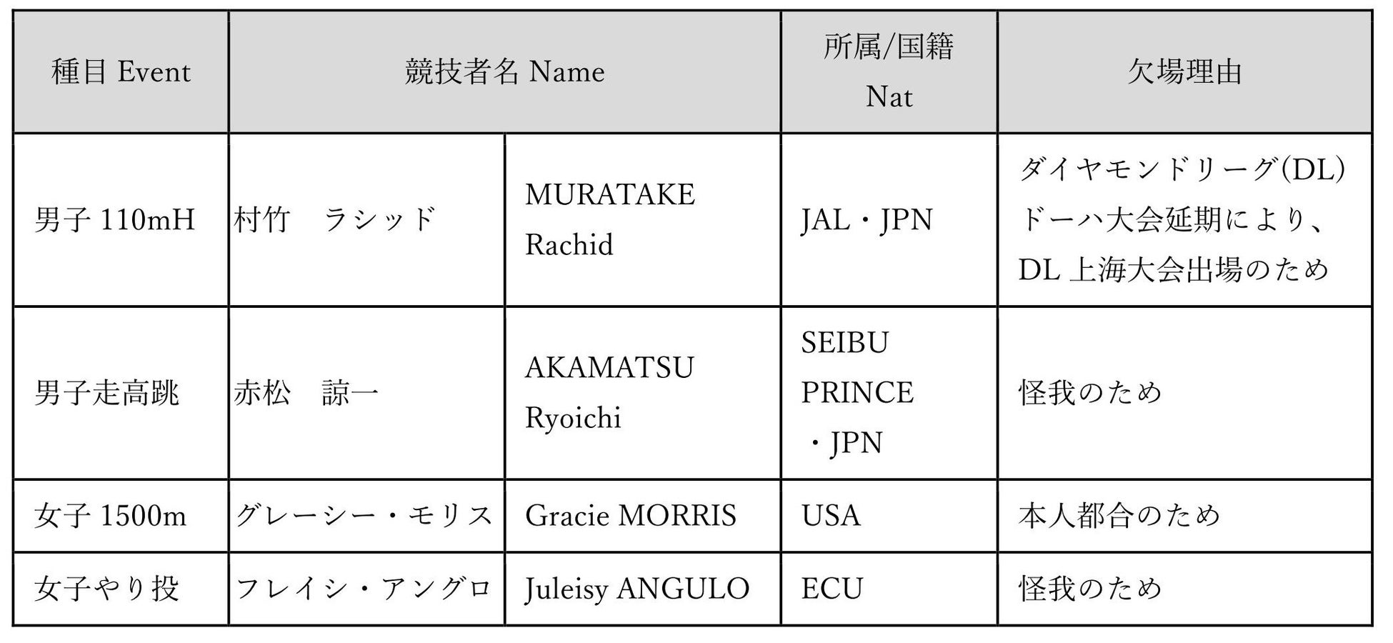 また、出場を予定しておりました男子110mH・村竹ラシッド(JAL)選手、男子走高跳・赤松諒一(SEIBU PRINCE)選手、女子1500m・グレーシーモリス(USA)選手、女子やり投・フレイシアングロ(ECU)選手が欠場することになりましたので、お知らせいたします。