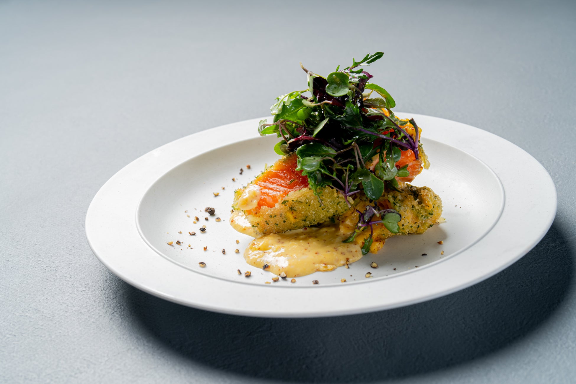 サーモンの香草パン粉焼き 温かいタルタルソースとハーブのサラダ黒毛和牛炭火焼きステーキ 黒ニンニクとフォンドボー