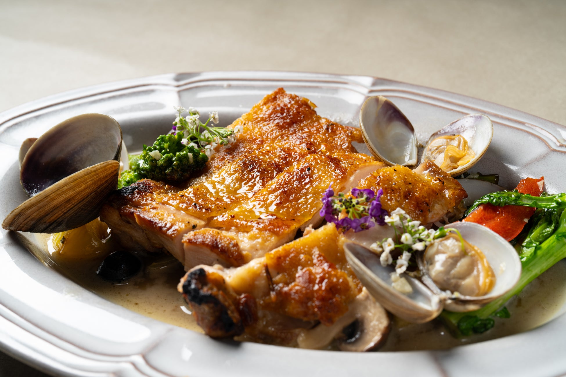 塩麹でマリネした若鶏の炭火焼きロースト アクアパッツァ仕立て