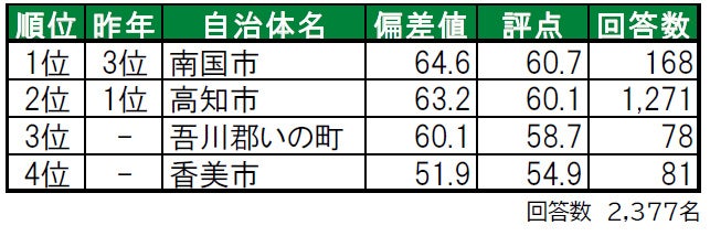 1位は南国市で、「街に愛着がある」1位、「街に誇りがある」2位、「住みここち」3位と各ランキングでも上位に入っている街です。2位は高知市で、「街に誇りがある」「住みたい街」1位、「住みここち」「街に愛着がある」2位、「街の幸福度」3位と、各ランキングで高評価を得ています。3位は、昨年はランキング外だった吾川郡いの町で、「街の幸福度」「住みここち」1位、「街に誇りがある」3位となっています。