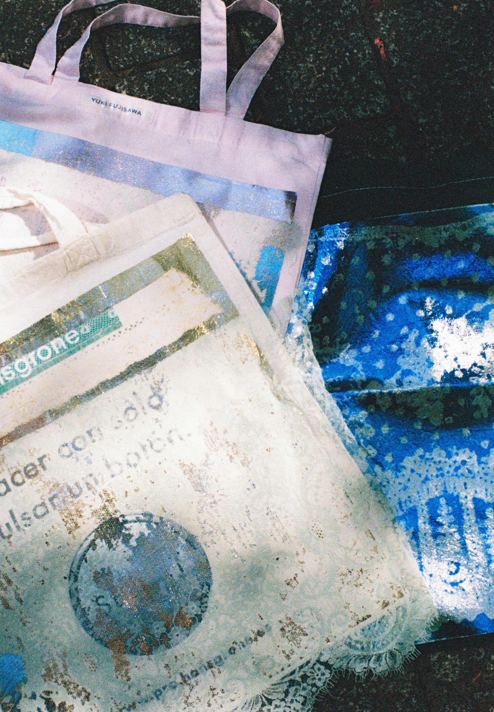 手紙に見られる切手や消印、筆跡といった物理的な要素に着目し、時間や記憶、誰かに想いを届ける行為をひとつの視点として、「YUKI FUJISAWA」のものづくりを再解釈。ブランドの定番アイテムでもあるヴィンテージのTシャツやトートバッグなどに染や箔を施したアートピース「NEW VINTAGE」に加え、本展のテーマおよびCIBONE CASE(銀座)のコンセプトから着想を得て制作された限定アイテムなど合計15種類の作品が並びます。